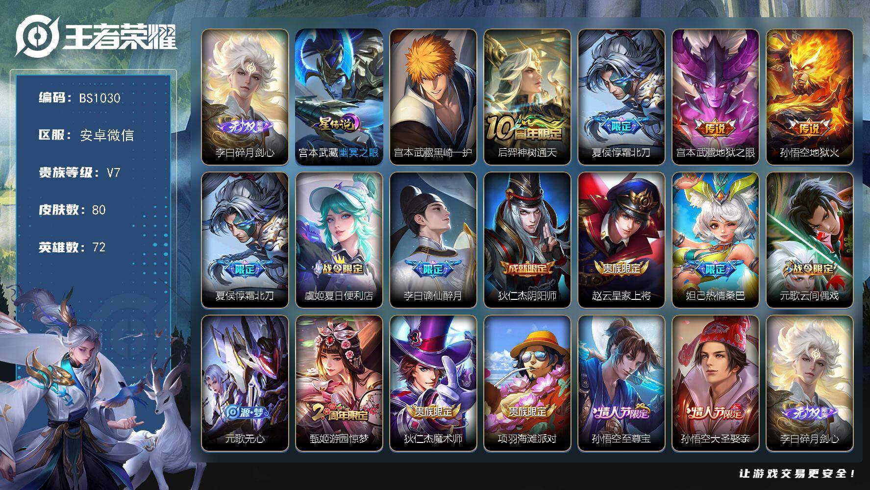 安卓WX 野王号!金标李白!【碎月剑心,黑崎一护】V7-80皮肤-1无双-1