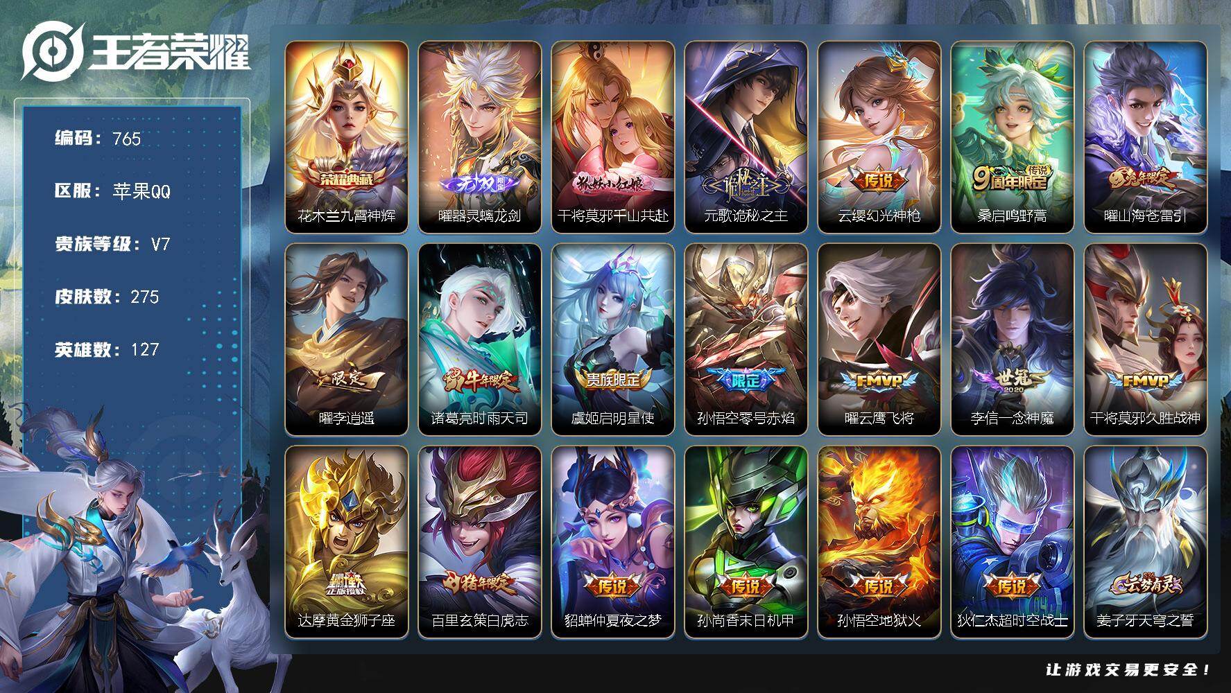 【W4715】安卓QQ-有二次-贵7-126英雄-143皮肤-4传说-44限定