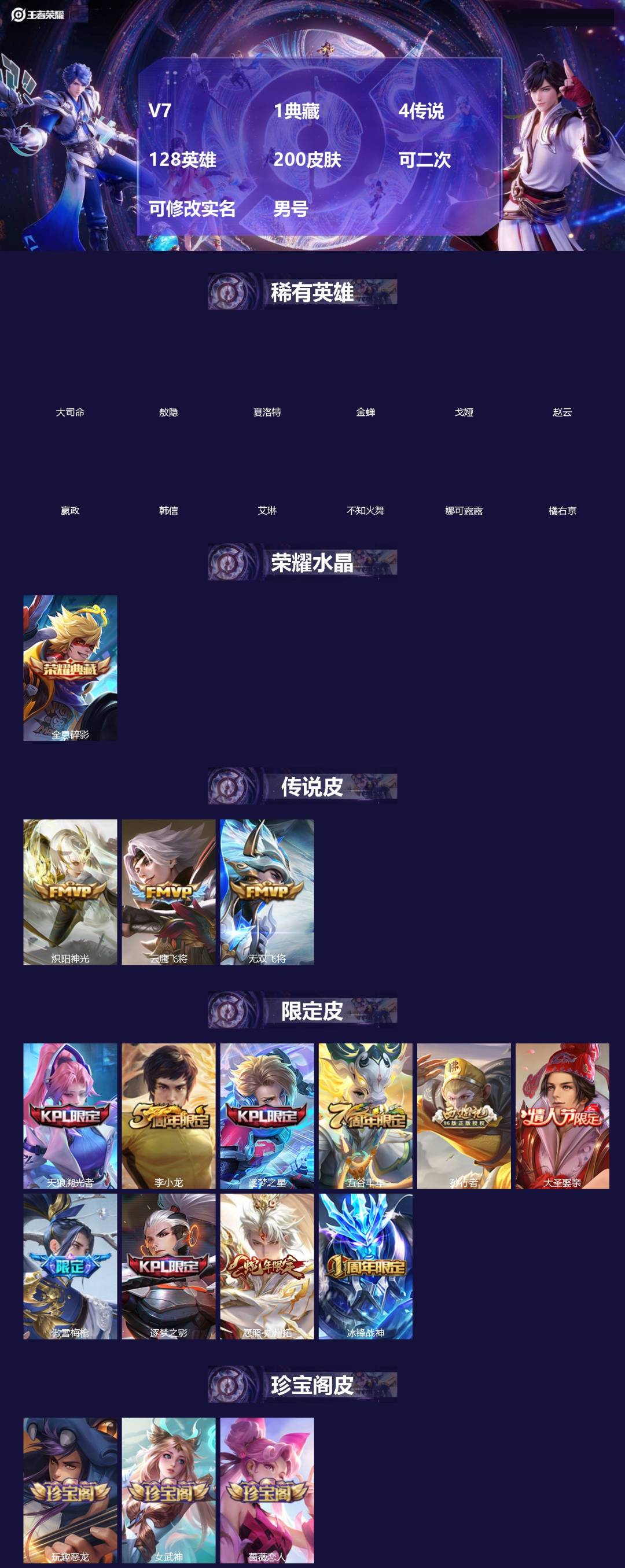 []V7 1典藏 4传说 128英雄 200皮肤 可二次 可修改实名 男号 【
