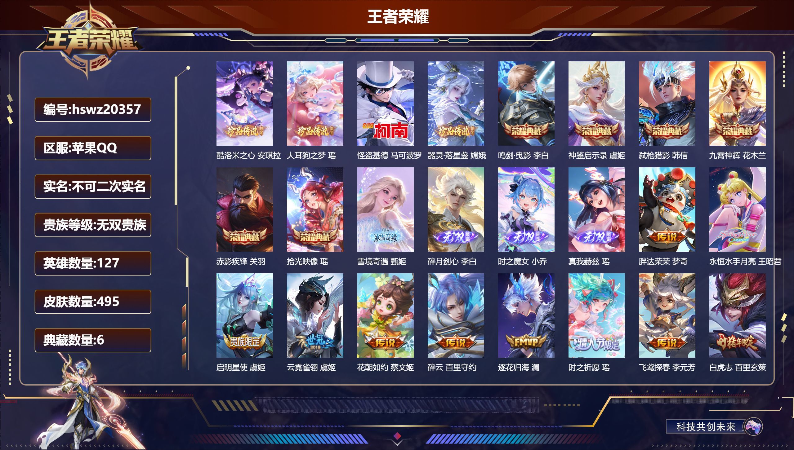 苹果QQ/传奇王者/489皮肤/128英雄/10典藏/0珍品无双/3无双/0珍品传说/64传说/16