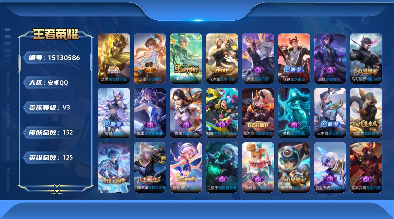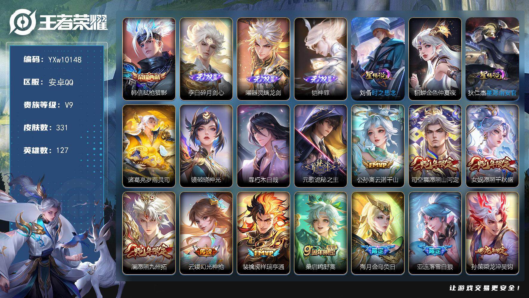 安卓QQ/绝世王者/483皮肤/127英雄/5典藏/0珍品无双/1无双/3珍品传说/56传说/148