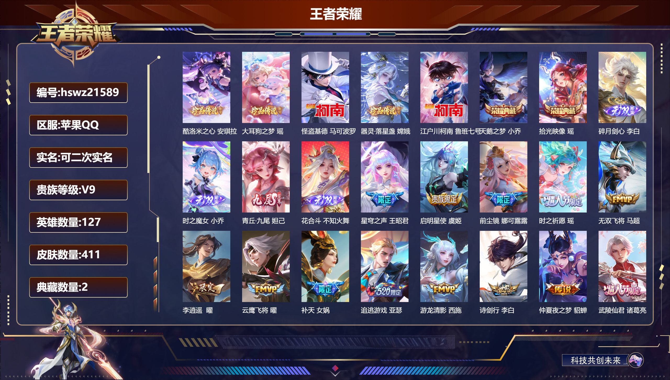 苹果QQ/最强王者/411皮肤/127英雄/2典藏/0珍品无双/4无双/5珍品传说/37传说/125