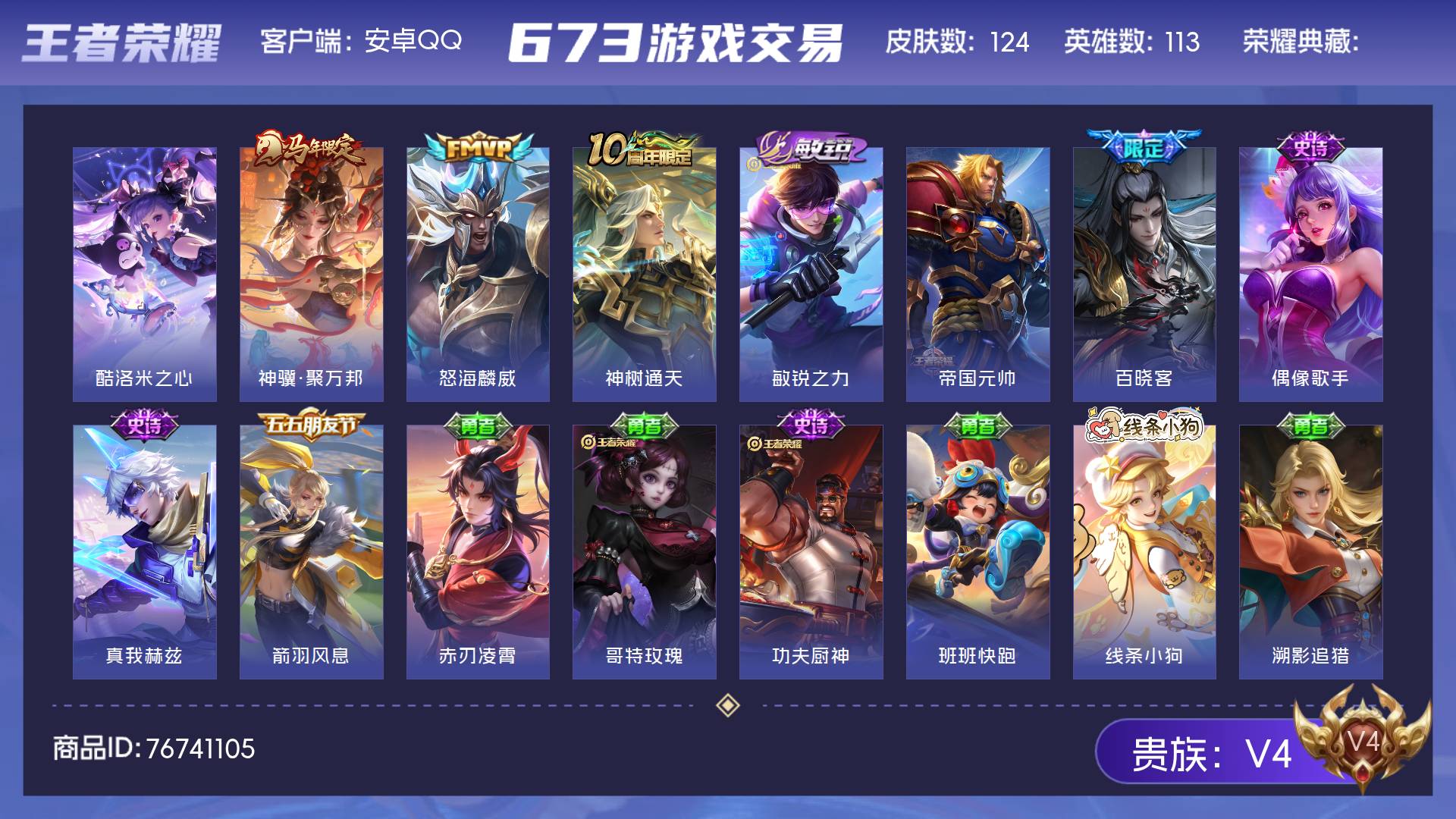 V4 皮肤124 英雄113 永恒钻石 珍品传说1 星传说1 传说3