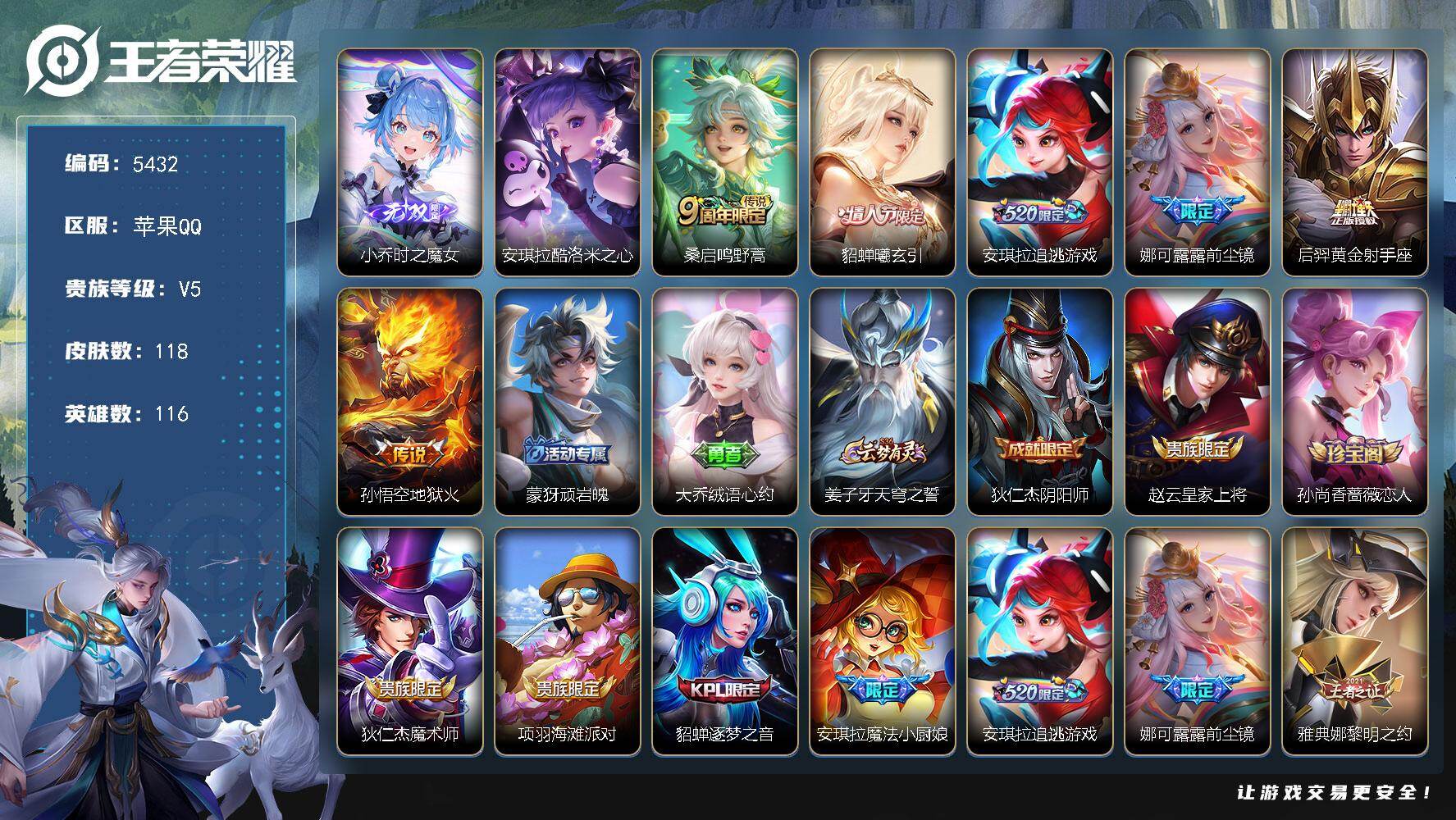 苹果Q-V5-尊贵铂金I段位-116英雄-118皮肤-1无双-1珍品传说-6传