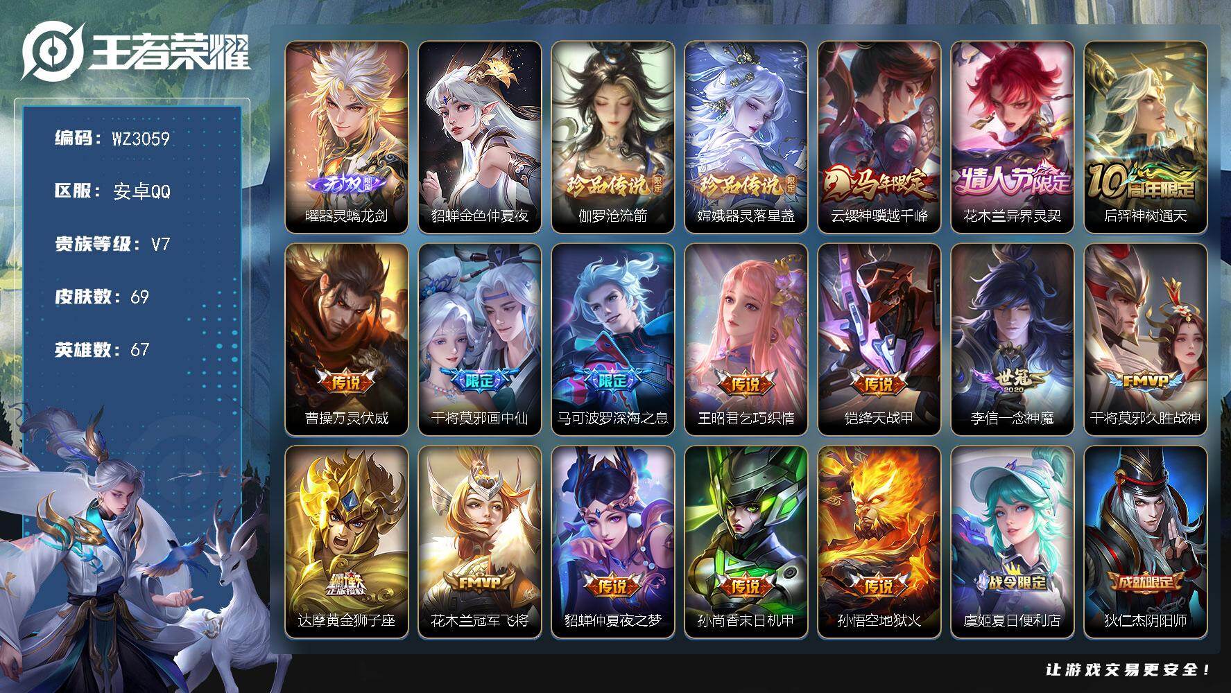 【秒换绑】安卓Q-V7-最强王者段位-67英雄-69皮肤-1无双-2珍品传说-