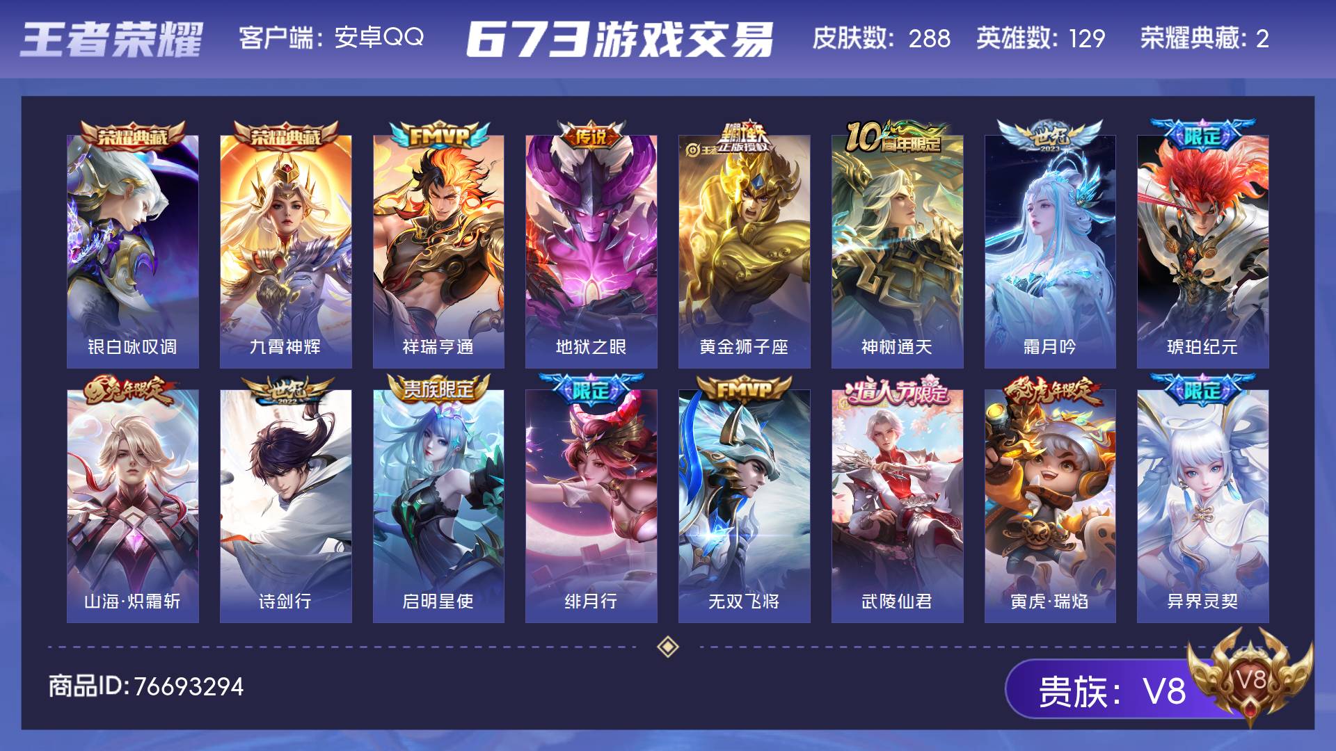 V8 皮肤288 英雄129 至尊星耀 荣耀典藏2 传说18