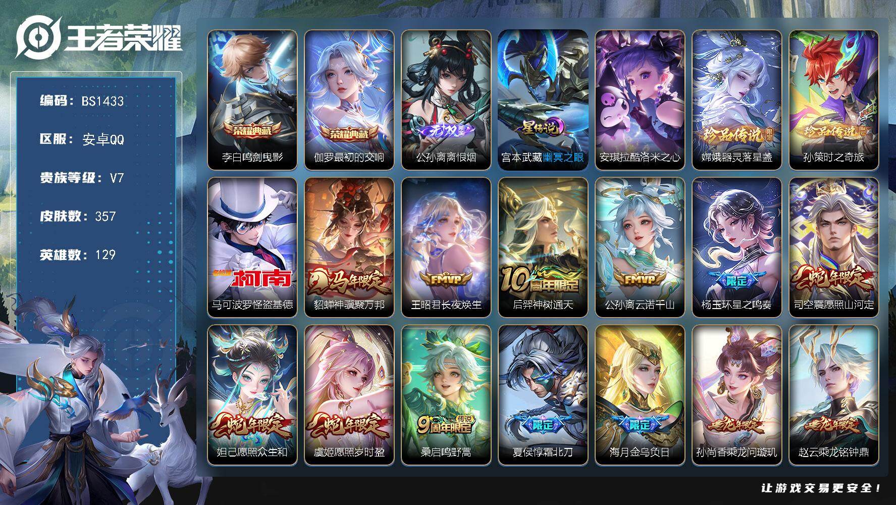 安卓Q-V7-尊贵铂金I段位-129英雄-357皮肤-2典藏皮肤-1无双-4珍