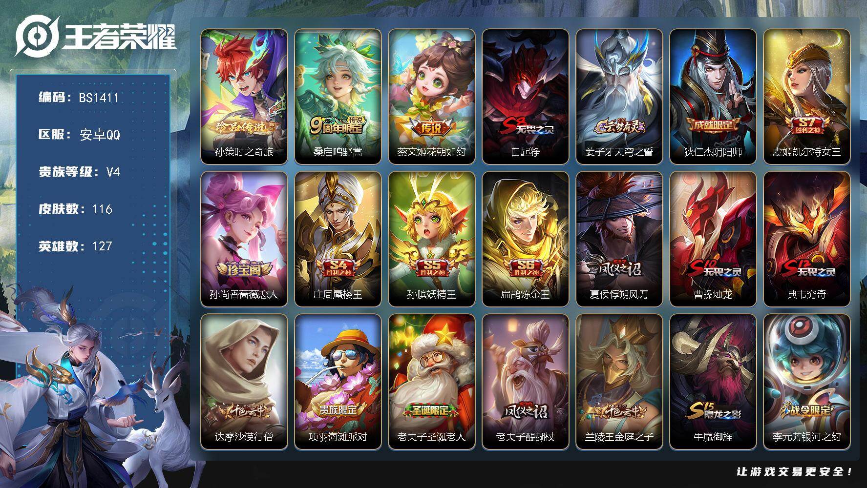 安卓Q-V4-永恒钻石IV段位-127英雄-116皮肤-1珍品传说-2传说-1