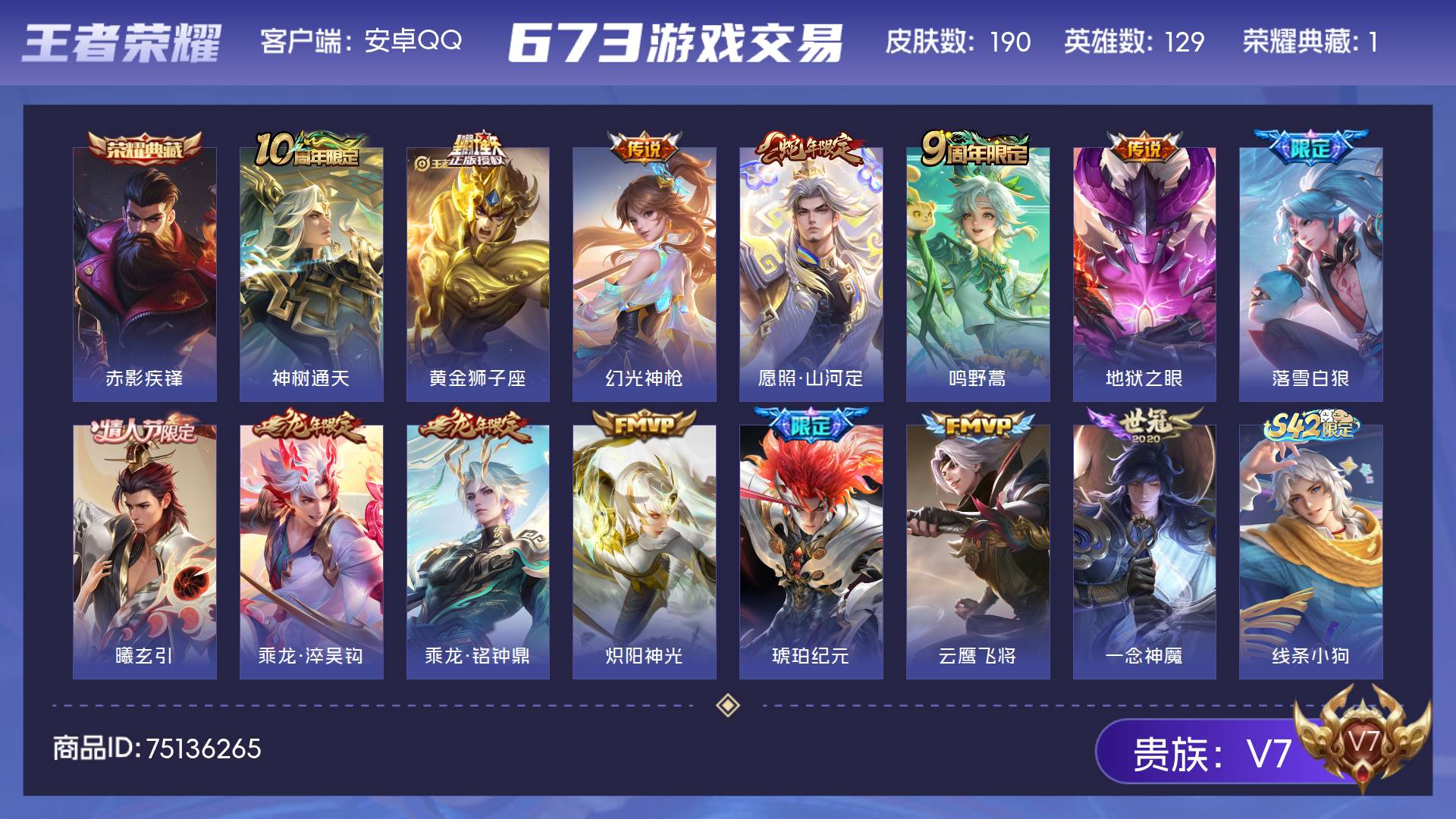 V7 皮肤190 英雄129 至尊星耀 荣耀典藏1 星传说2 传说15 其他皮肤179