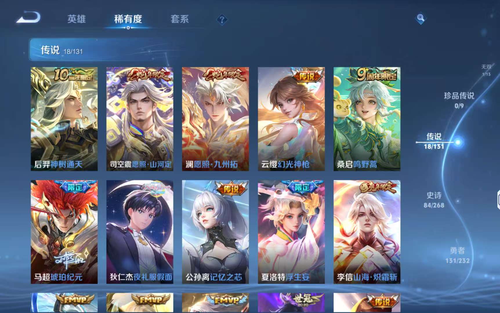 V10 皮肤461 英雄129 传奇王者 荣耀典藏6 无双皮肤1 传说53 其他皮肤408