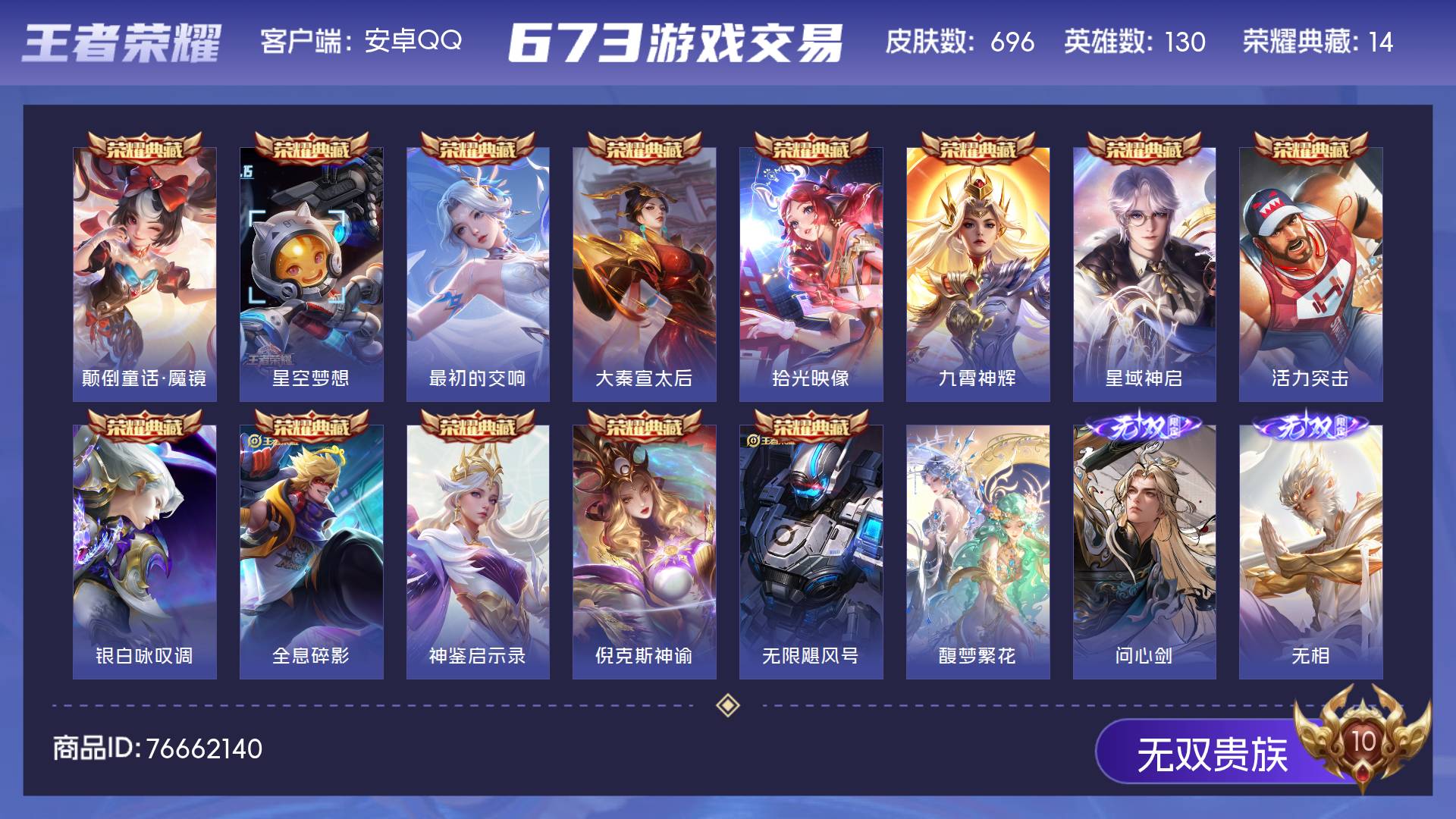 无双贵族 皮肤696 英雄130 至尊星耀 荣耀典藏14 珍品无双1 无双皮肤14 珍品传说10 传说130