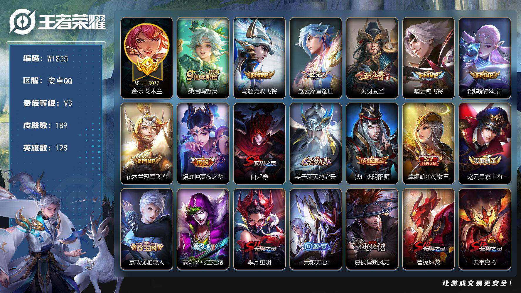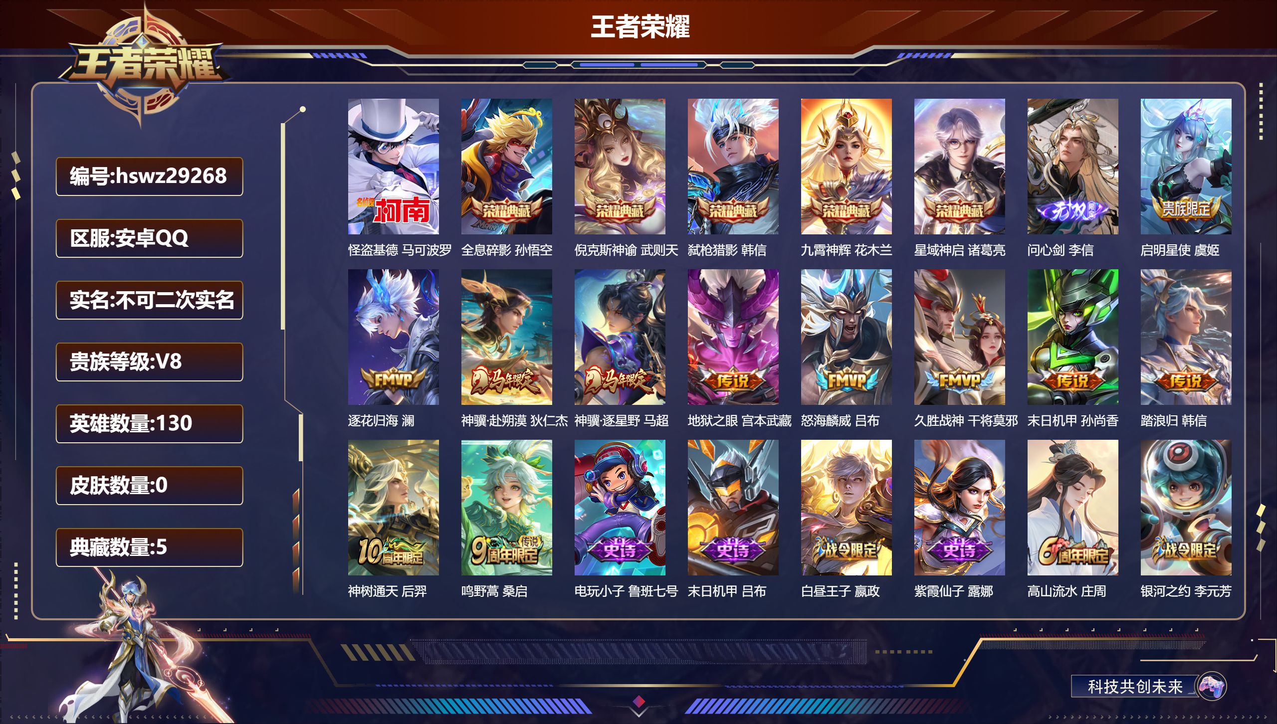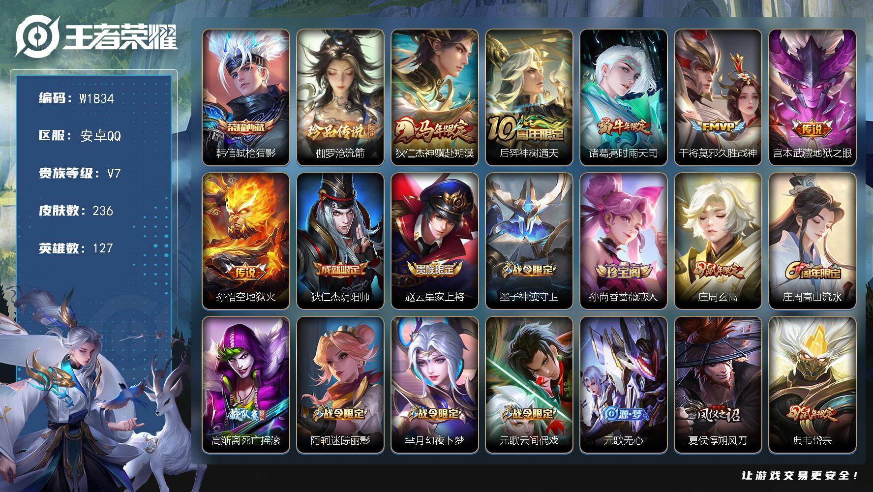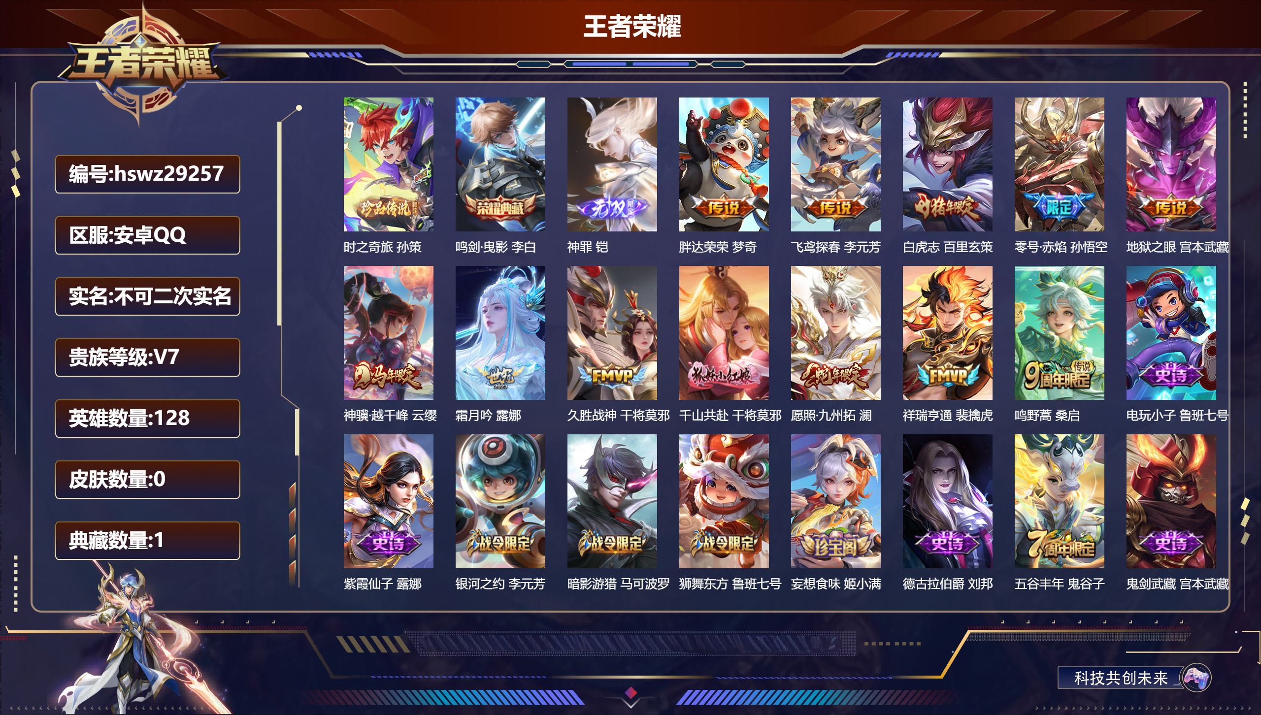 安卓QQ/至尊星耀/235皮肤/128英雄/1典藏/0珍品无双/1无双/1珍品传