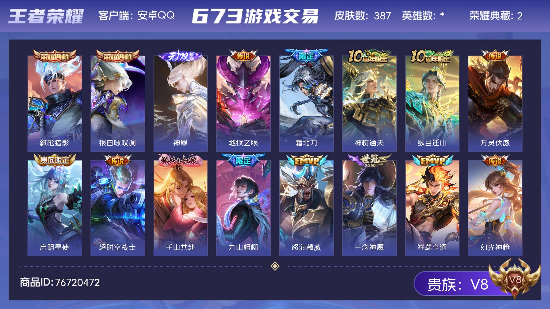 V8 皮肤387 英雄* 至尊星耀 荣耀典藏2 无双皮肤1 传说18