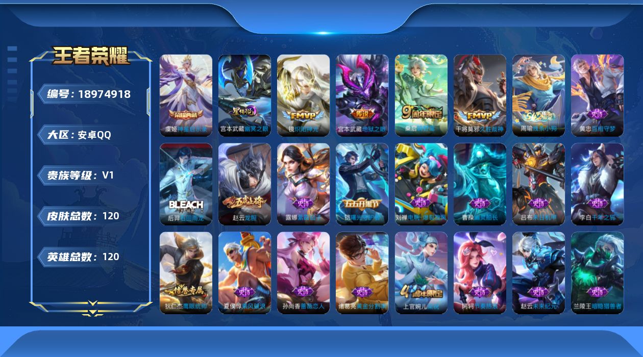 安卓QQ/至尊星耀/349皮肤/129英雄/2典藏/0珍品无双/2无双/0珍品传
