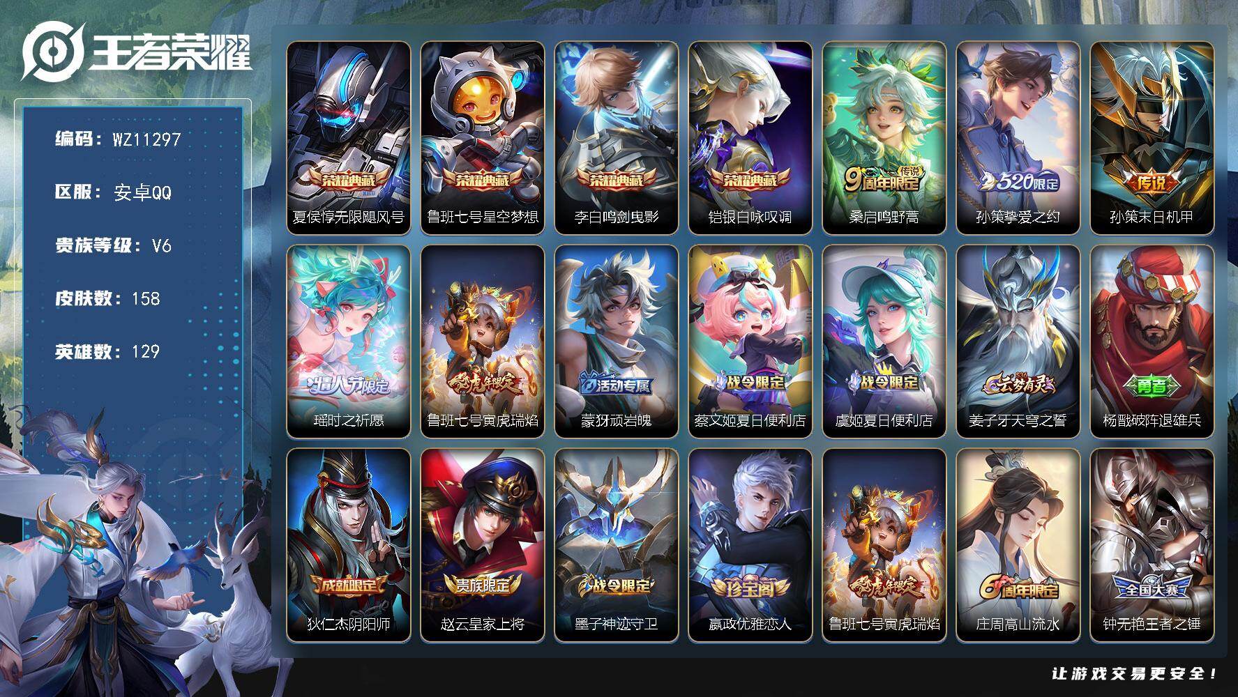 安卓Q-V6-尊贵铂金III段位-129英雄-158皮肤-4典藏皮肤-5传说-4