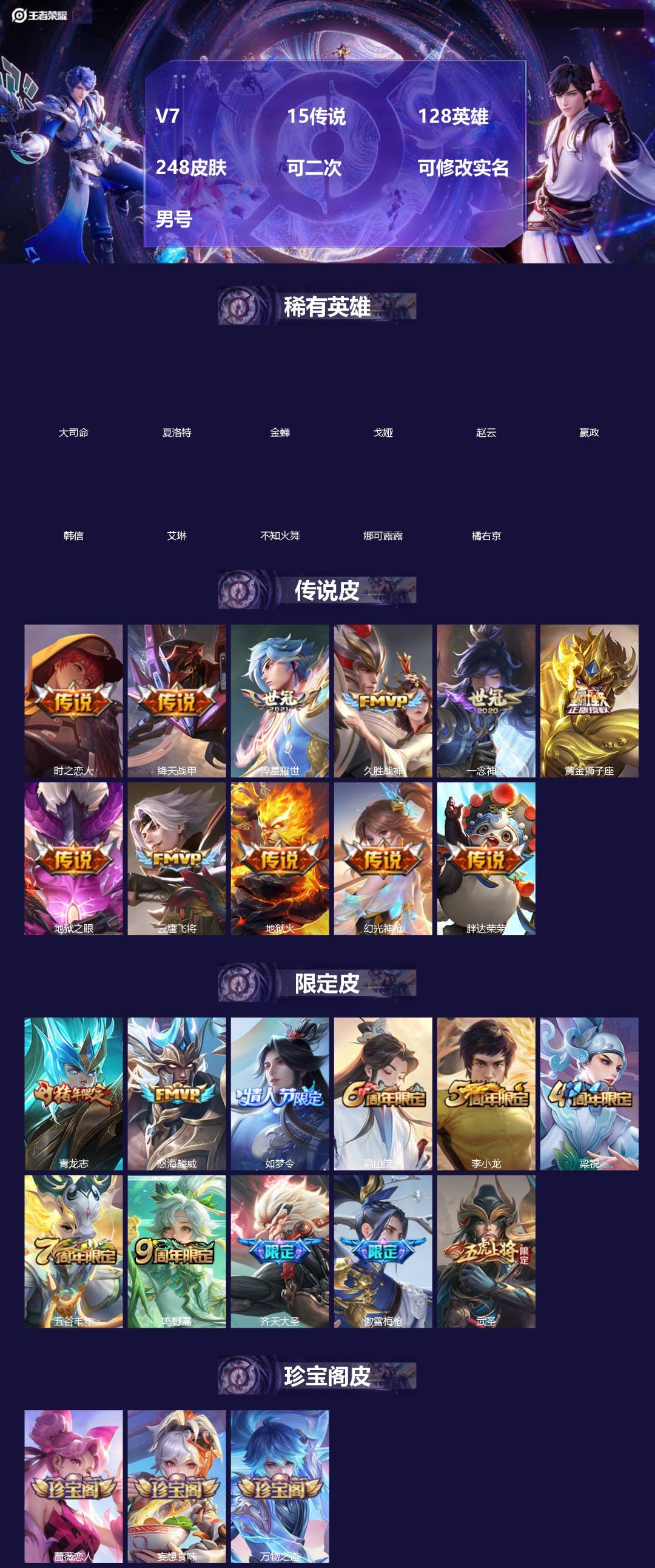 []V7 1典藏 1无双 2珍品传说 14传说 126英雄 185皮肤 可二次