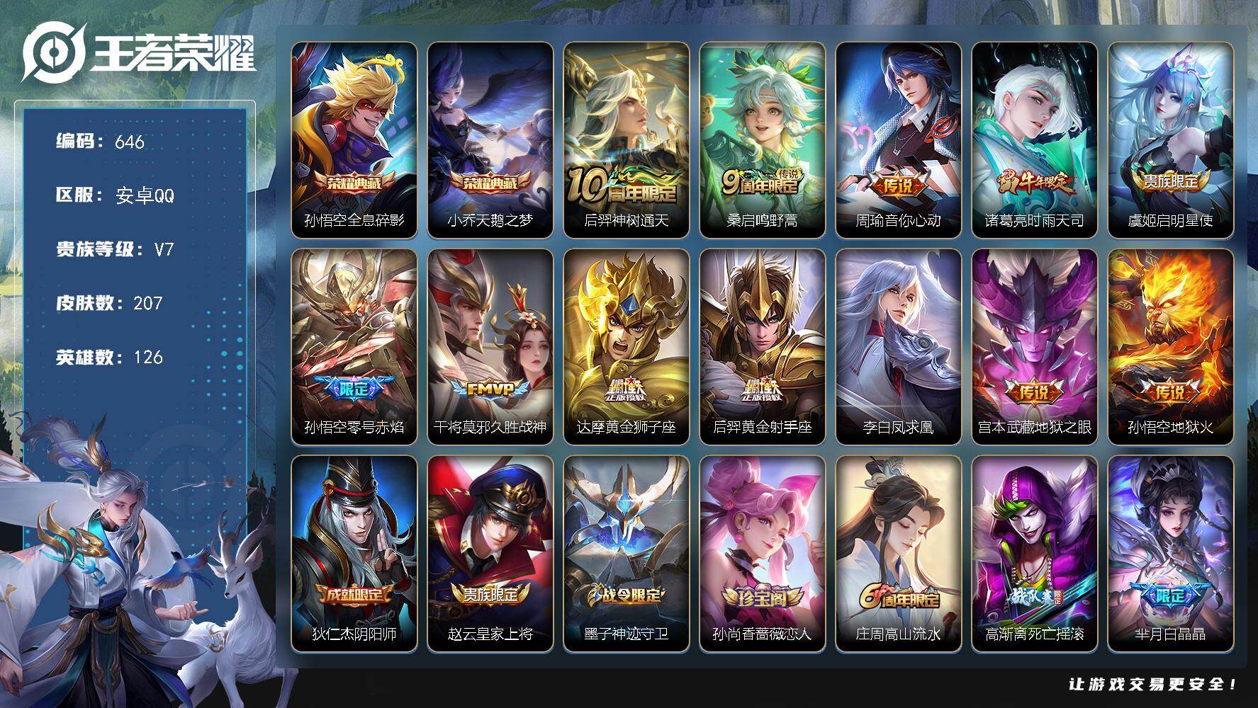 安卓Q-V7-尊贵铂金I段位-126英雄-207皮肤-2典藏皮肤-12传说-5