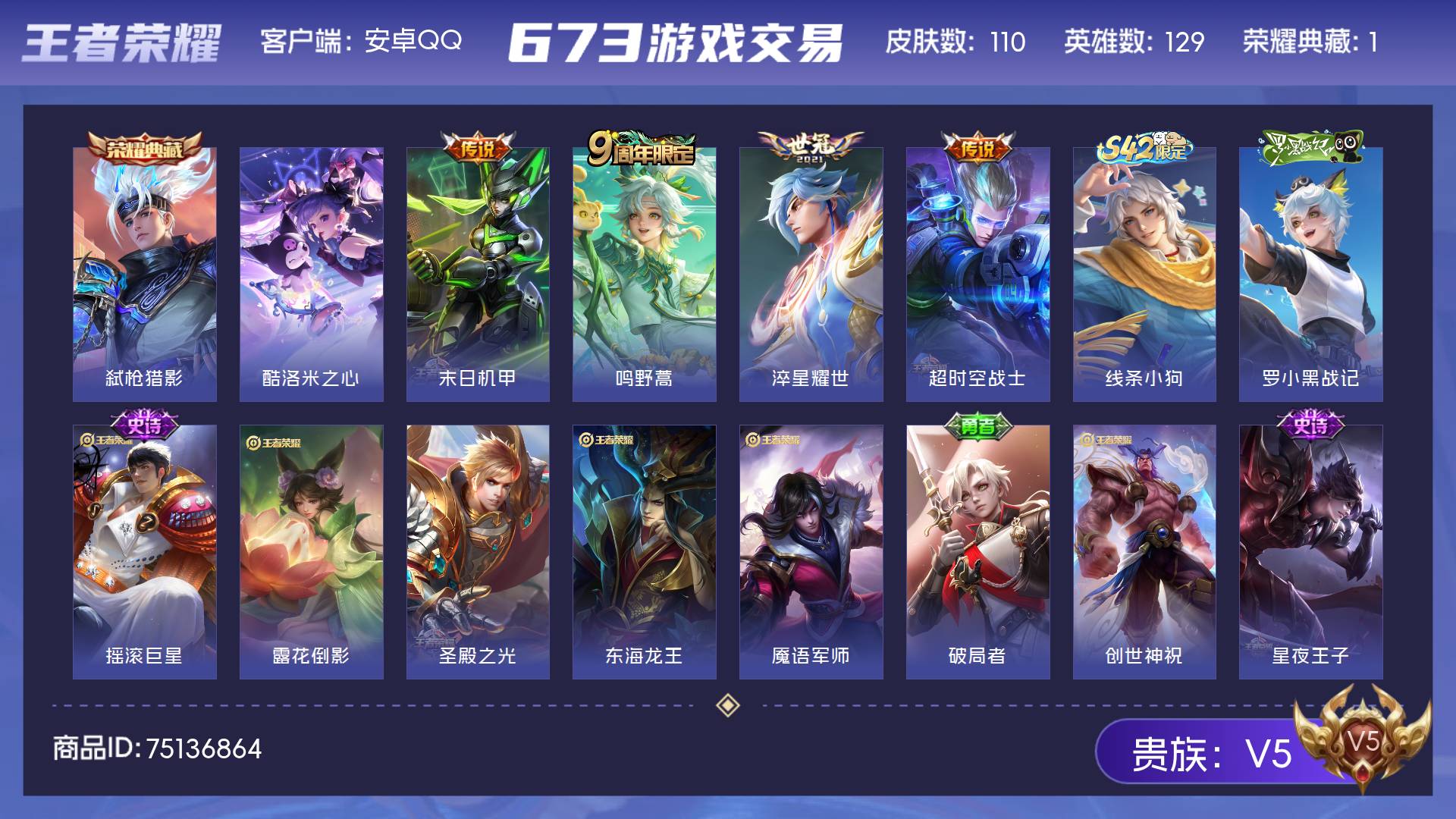 V5 皮肤110 英雄129 永恒钻石 荣耀典藏1 珍品传说1 传说4 其他皮肤110