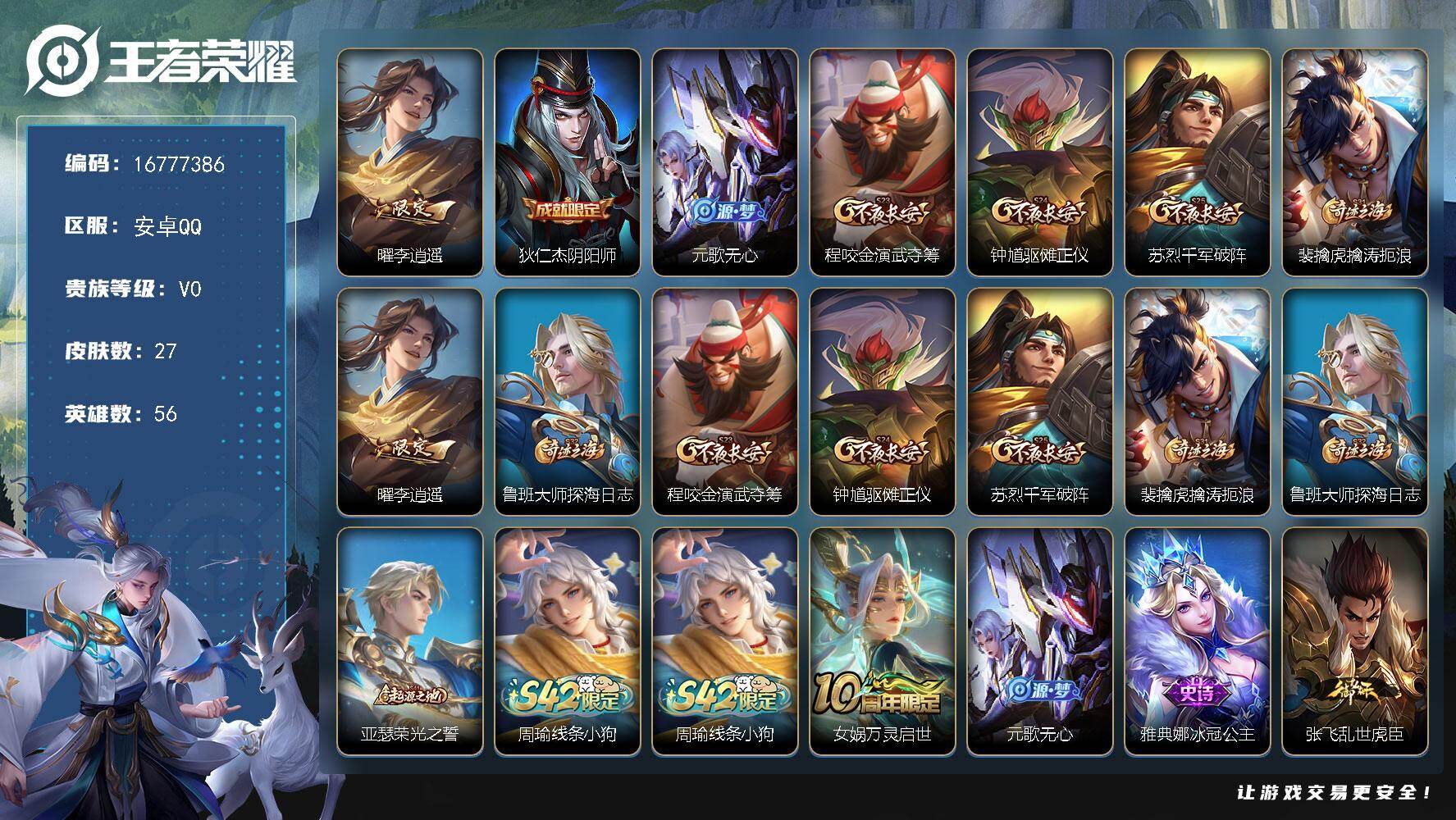 【16777386】贵族等级0/传说皮肤数量1/史诗皮肤数量4/皮肤数量27/