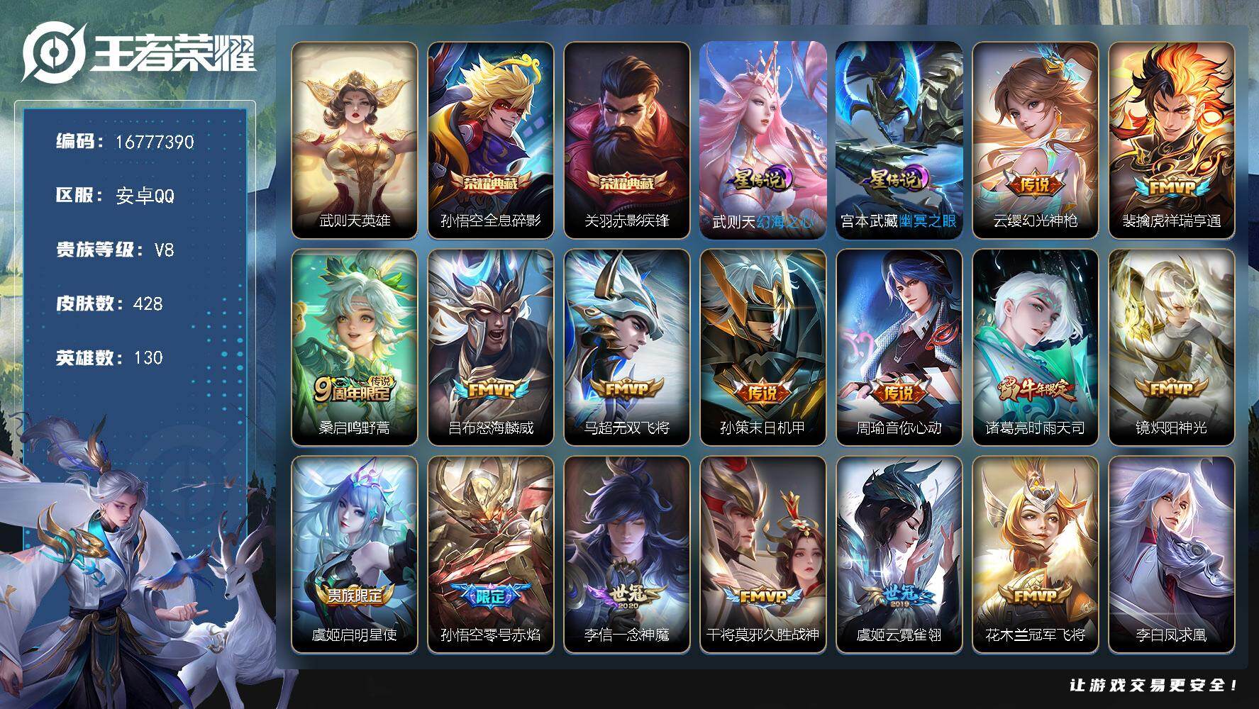 【16777390】贵族等级8/荣耀典藏数量2/传说皮肤数量17/史诗皮肤数量