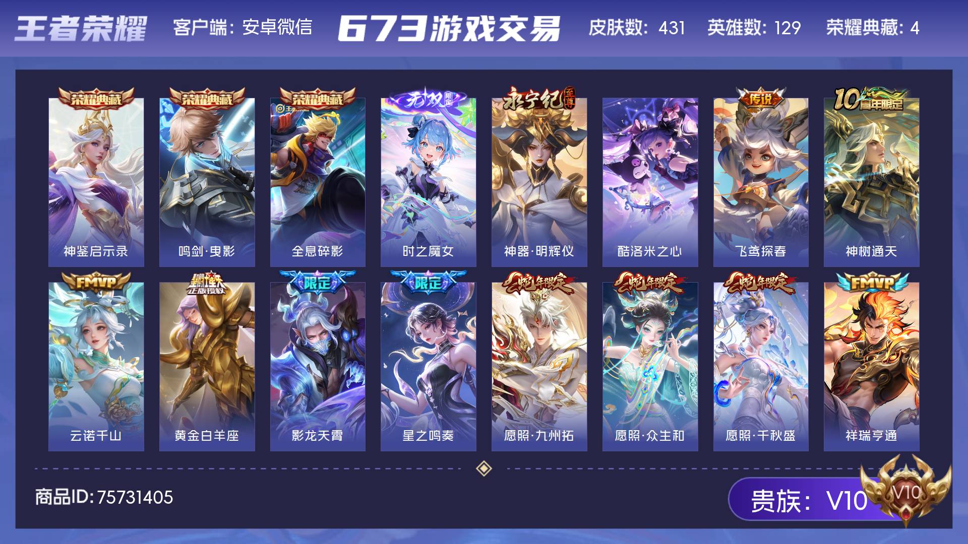 V10 皮肤431 英雄129 至尊星耀 荣耀典藏4 无双皮肤2 珍品传说1 传说45 其他皮肤386