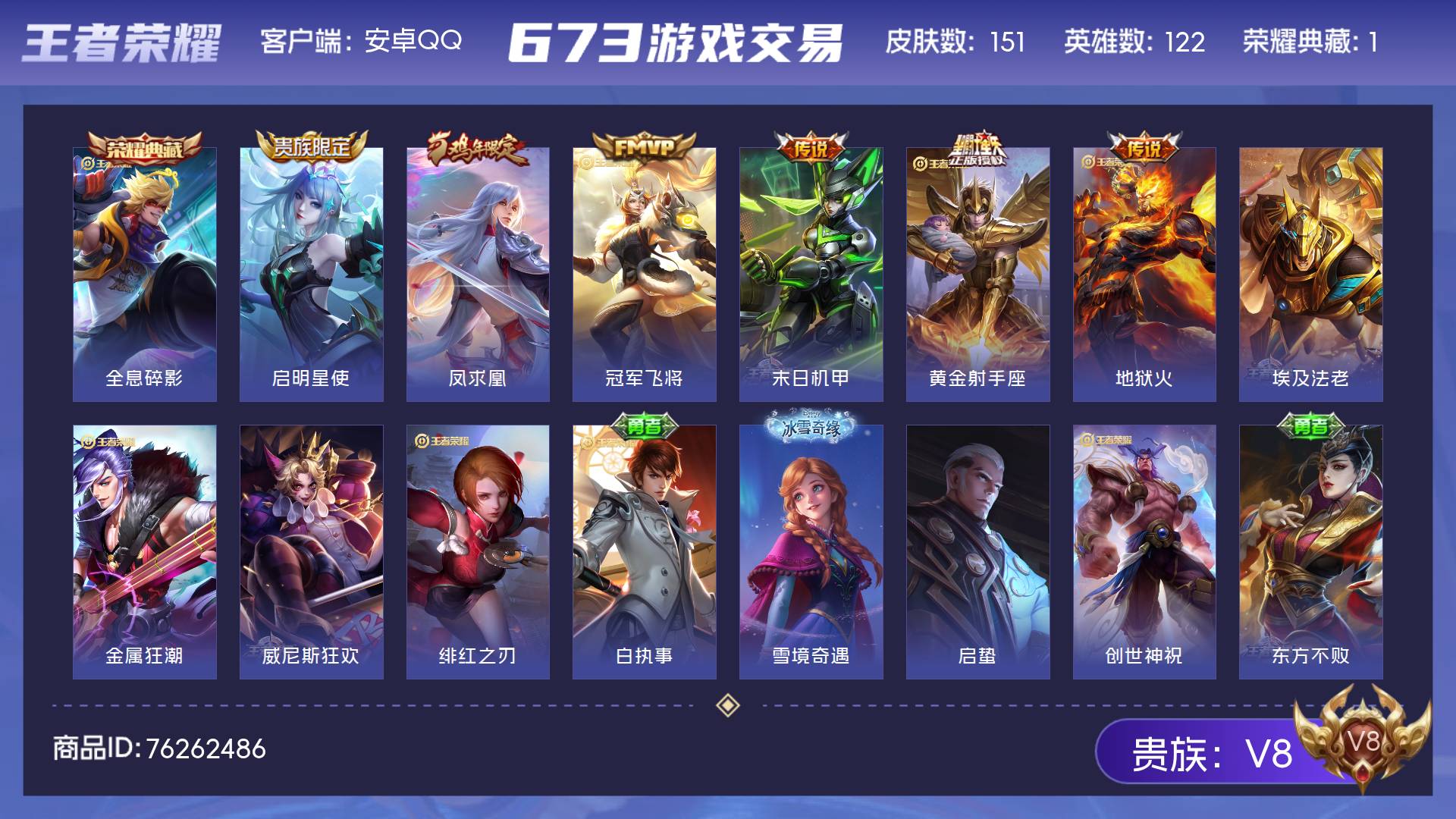 V8 皮肤151 英雄122 永恒钻石 荣耀典藏1 星传说1 传说6