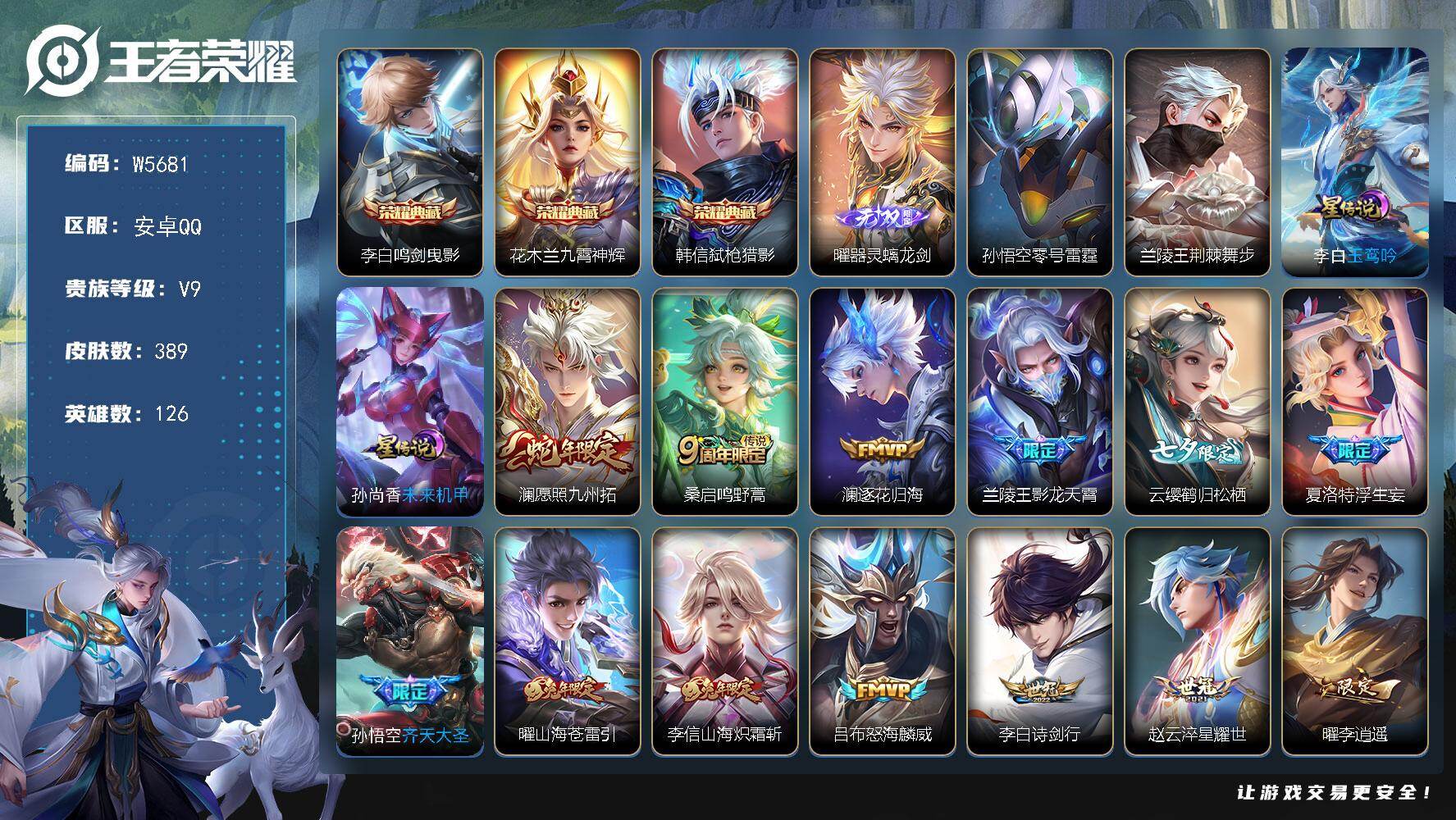 有二次-贵9-126英雄-389皮肤-3典藏-1无双-4星元-27传说-144限定-16按键-贵族积分11.8w