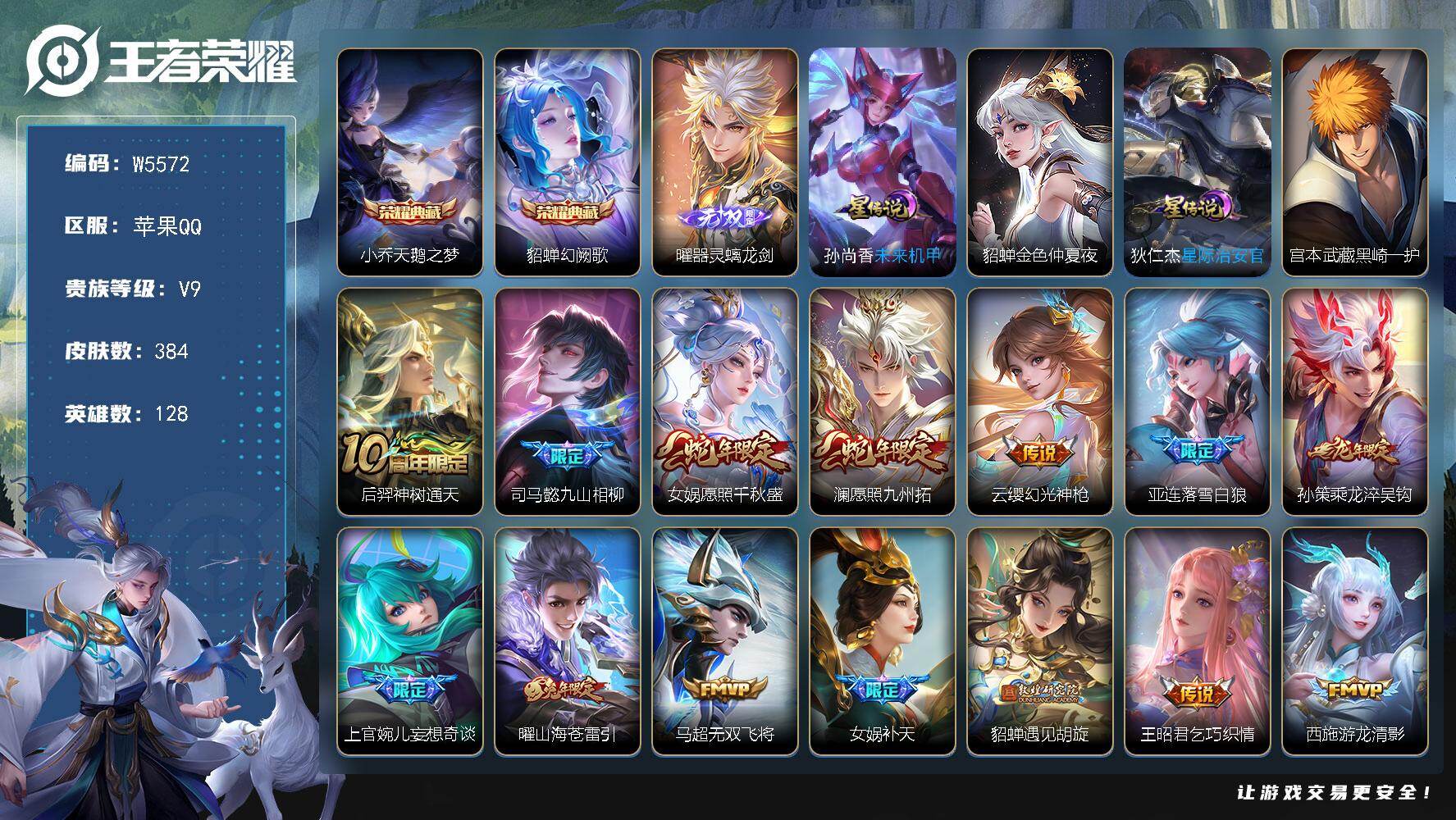 无二次-贵9-128英雄-384皮肤-2典藏-1无双-1珍品-3星元-27传说-129限定-1天幕-16按键-贵族积分11.6w