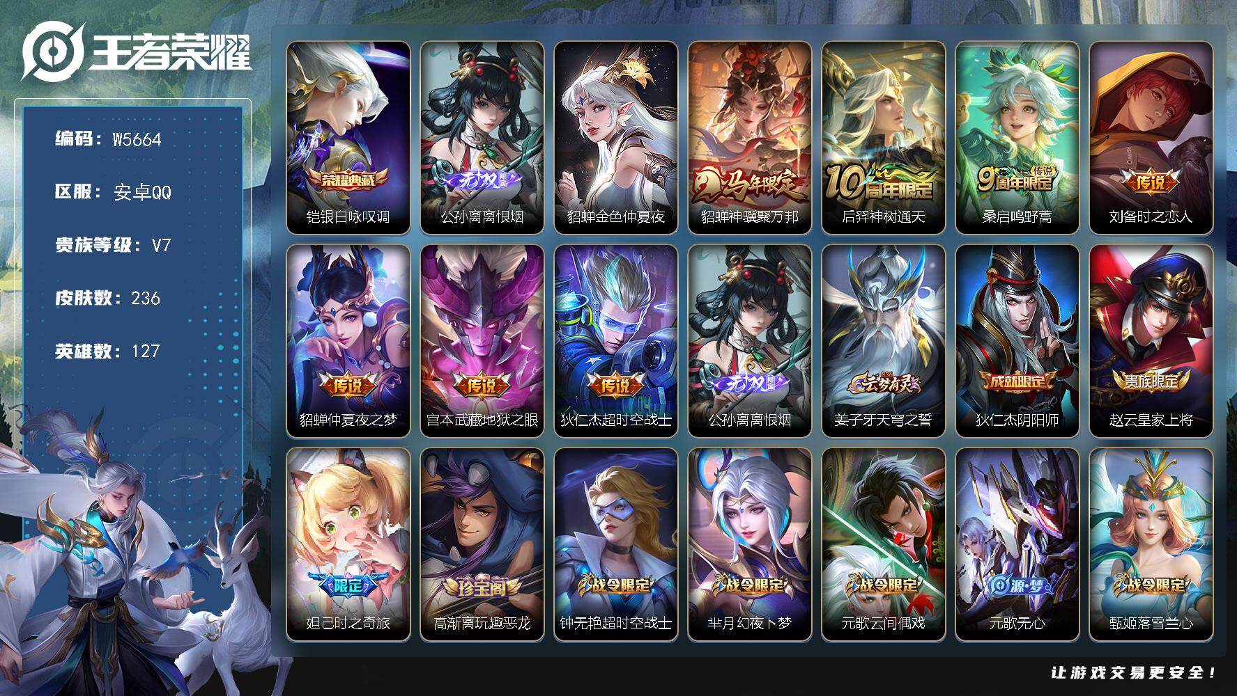不可二次-贵7-127英雄-236皮肤-1典藏-1无双-1星元-7传说-73限定-8个性按键.贵族积分2.6万