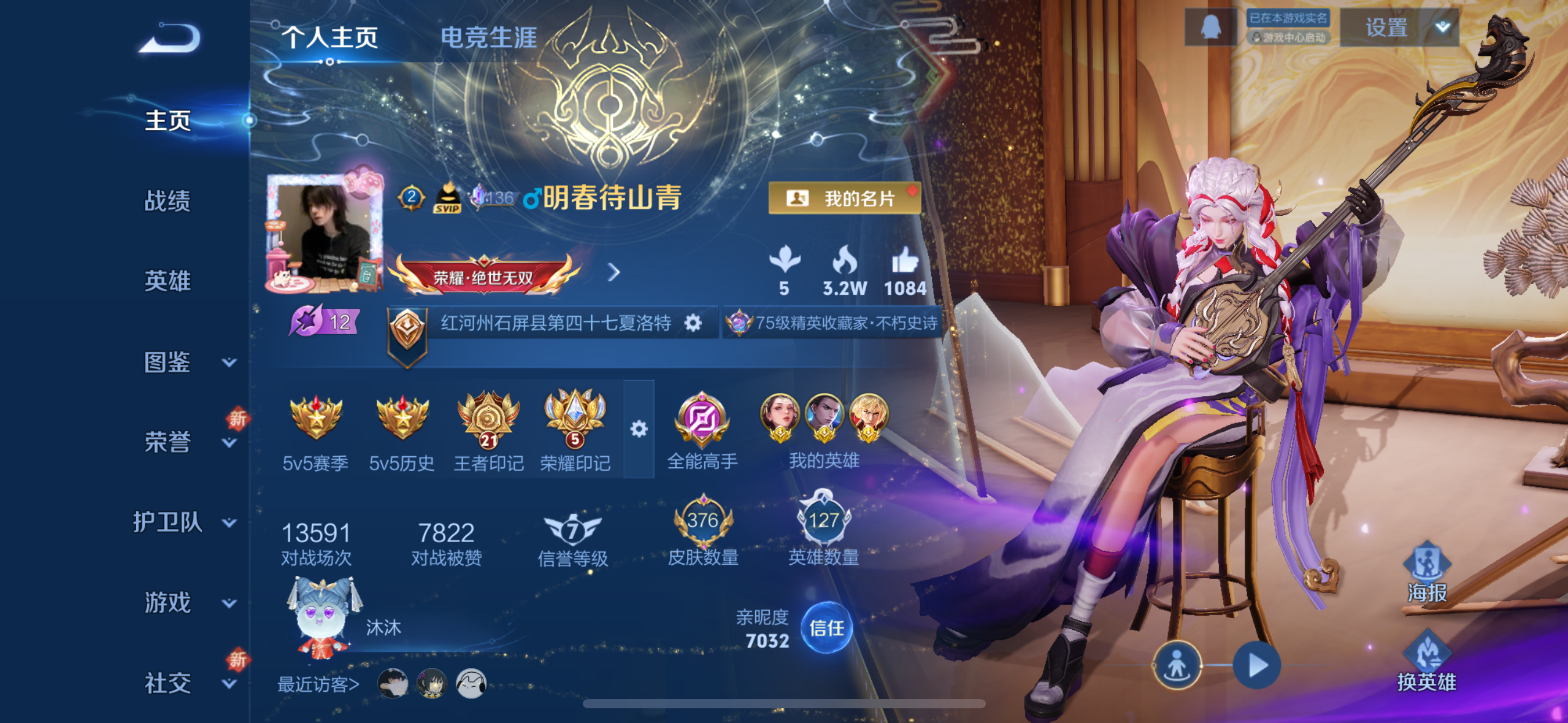 实名: 可修改 贵族等级: V7 英雄数: 126 皮肤数: 185 传说皮: