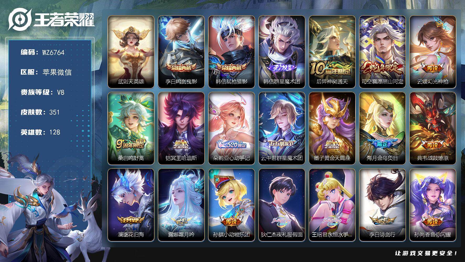 苹果WX-V8-至尊星耀III段位-128英雄-351皮肤-2典藏皮肤-1典藏