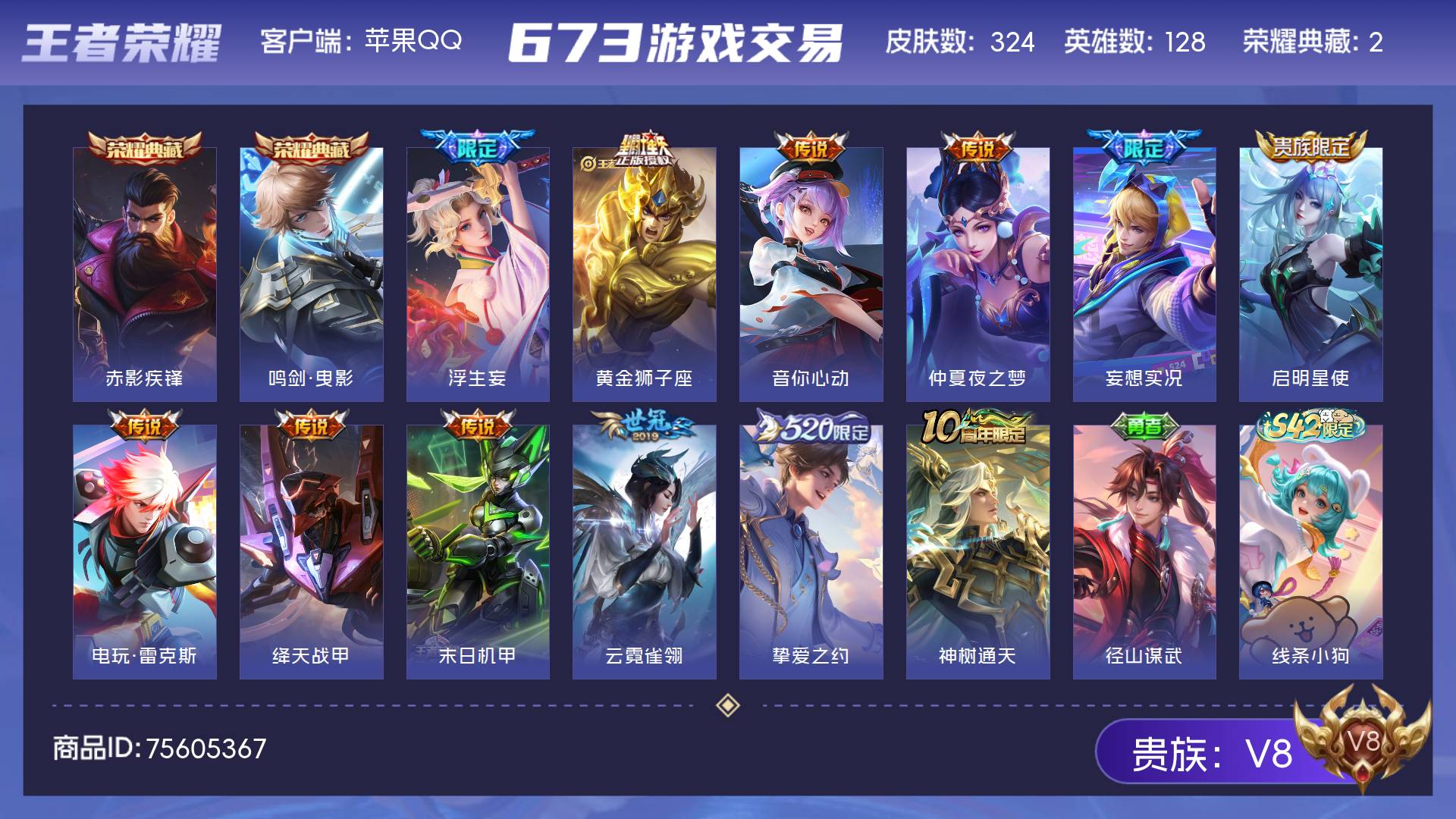 V8 皮肤324 英雄128 至尊星耀 荣耀典藏2 星传说4 传说12 其他皮肤312