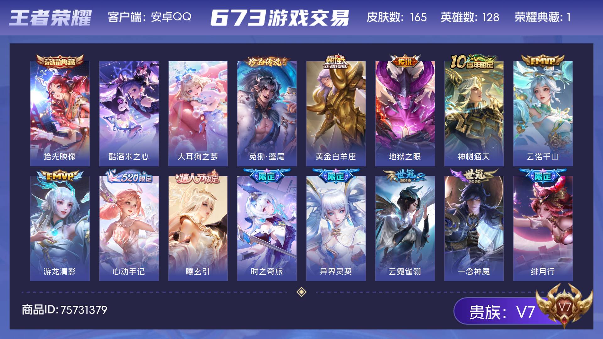 V7 皮肤165 英雄128 至尊星耀 荣耀典藏1 珍品传说3 传说14 其他皮肤152