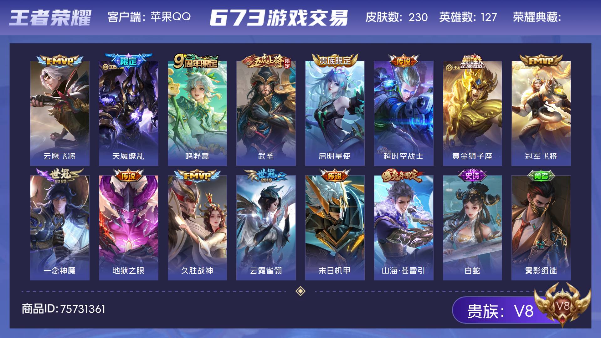 V8 皮肤230 英雄127 尊贵铂金 传说15 其他皮肤221