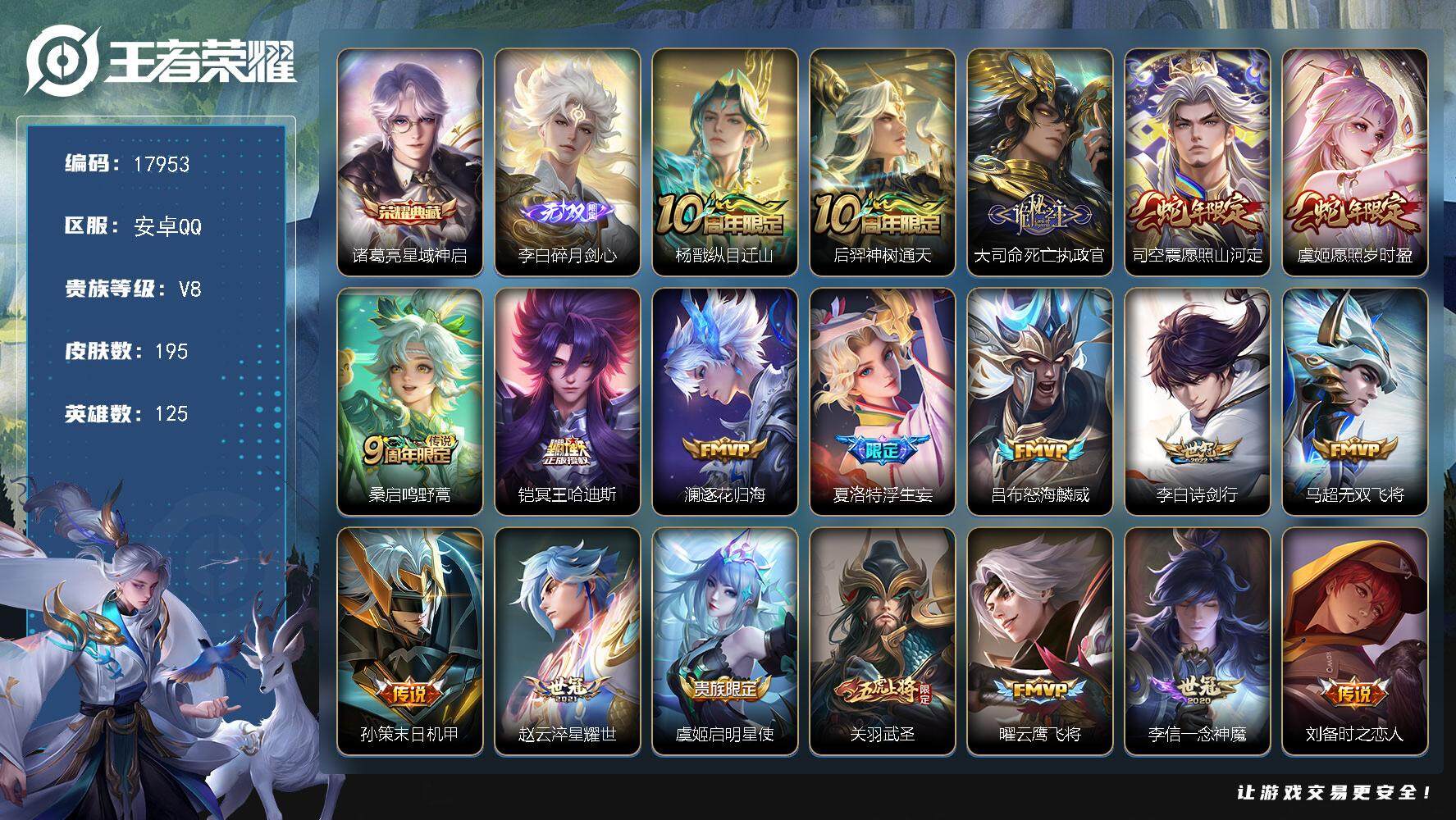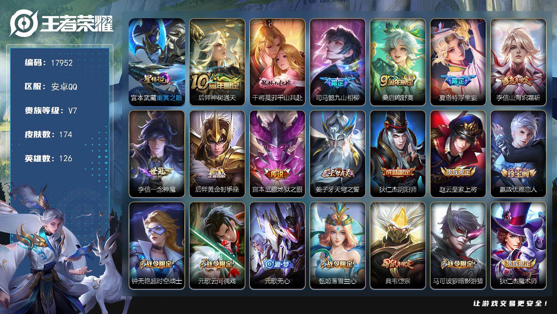 安卓QQ-1典藏-7传说-209皮肤-125英雄-荣耀王者-王者荣耀成品号1w分耀