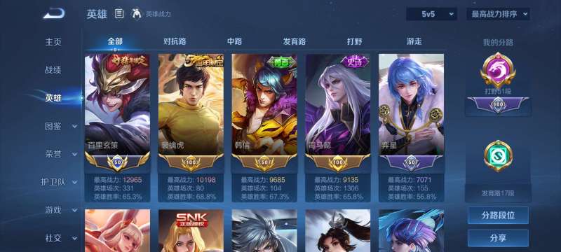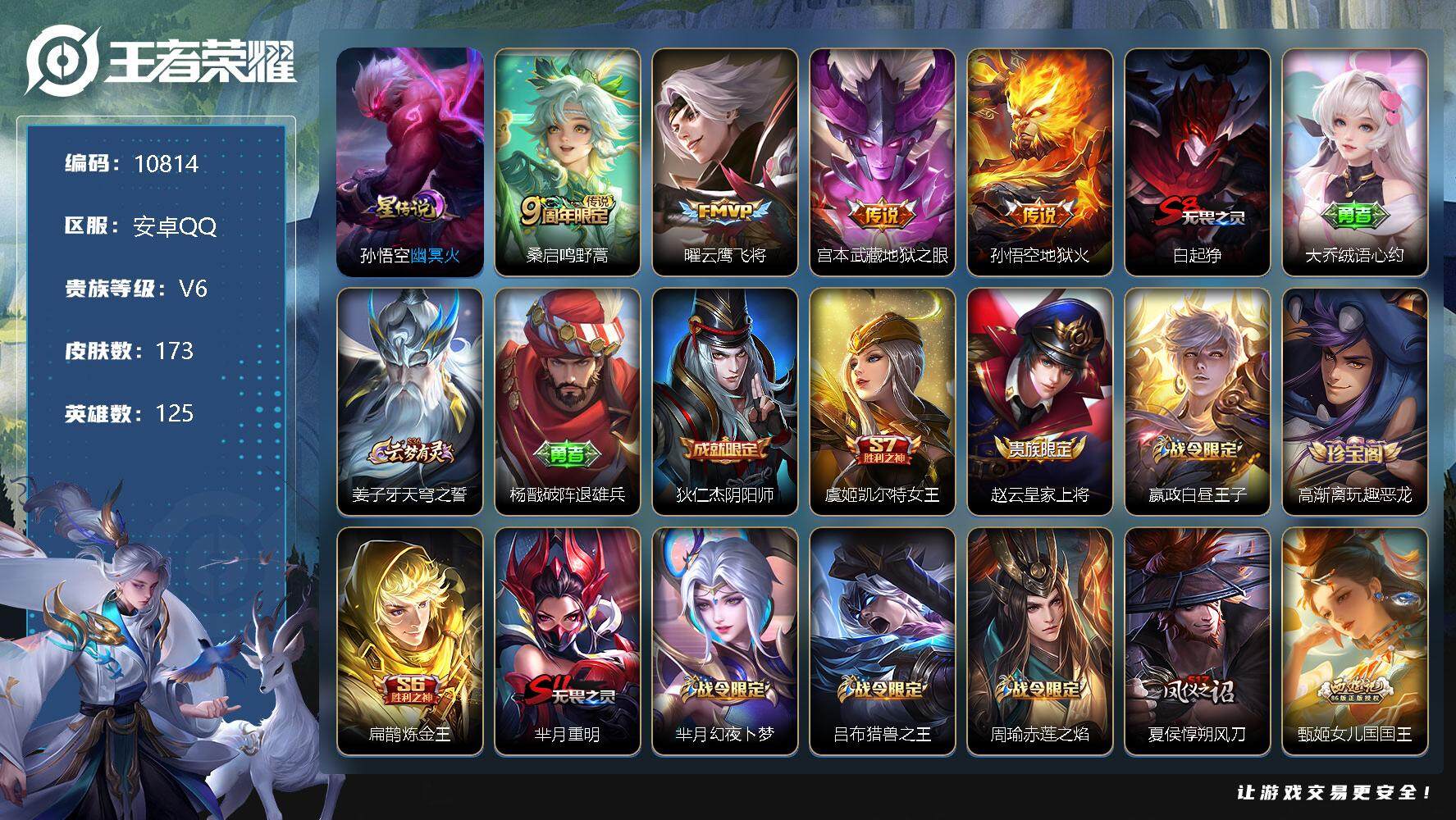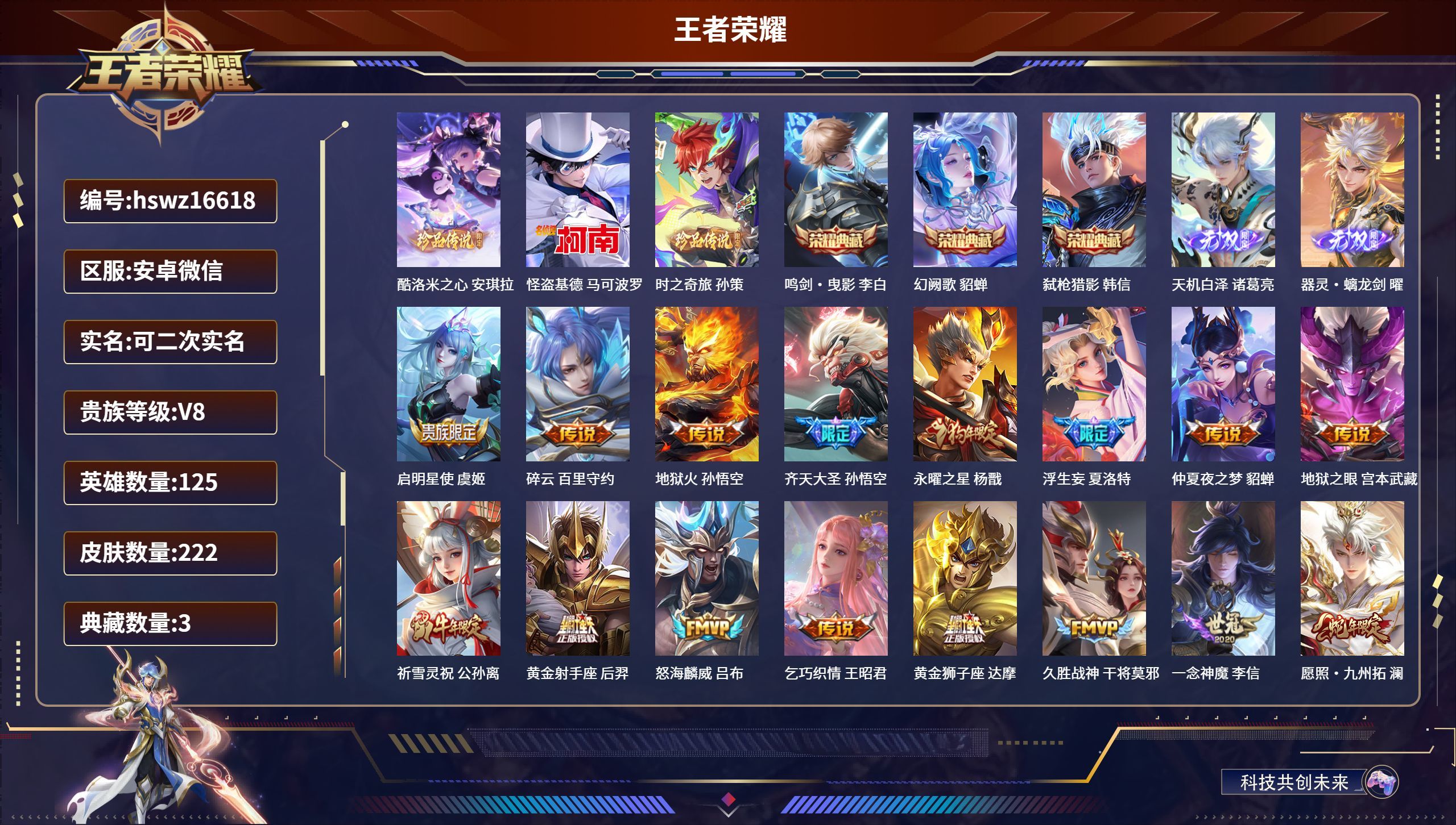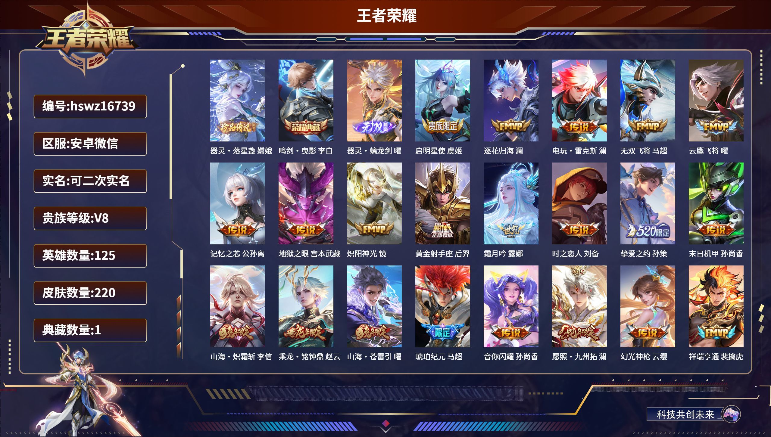 安卓v/至尊星耀/220皮肤/125英雄/1典藏/0珍品无双/1无双/1珍品传说/22传说/68史