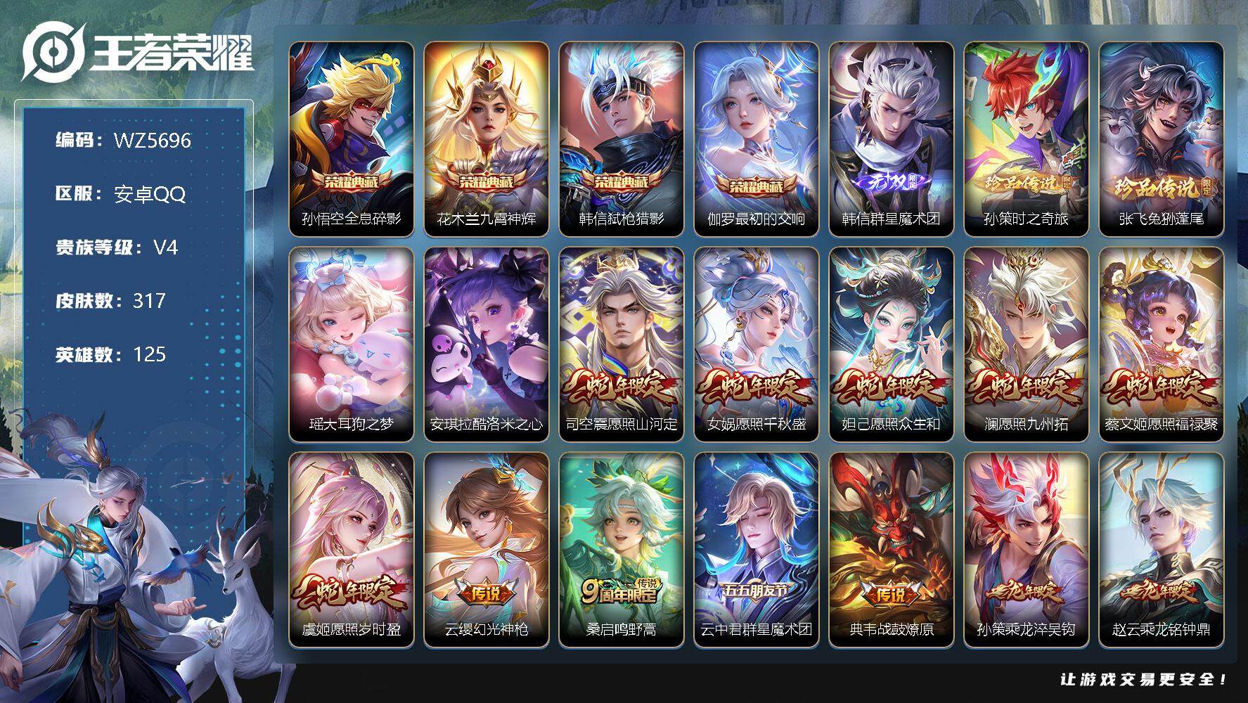 安卓v/荣耀王者/222皮肤/125英雄/3典藏/1珍品无双/2无双/3珍品传说/20传说/51史