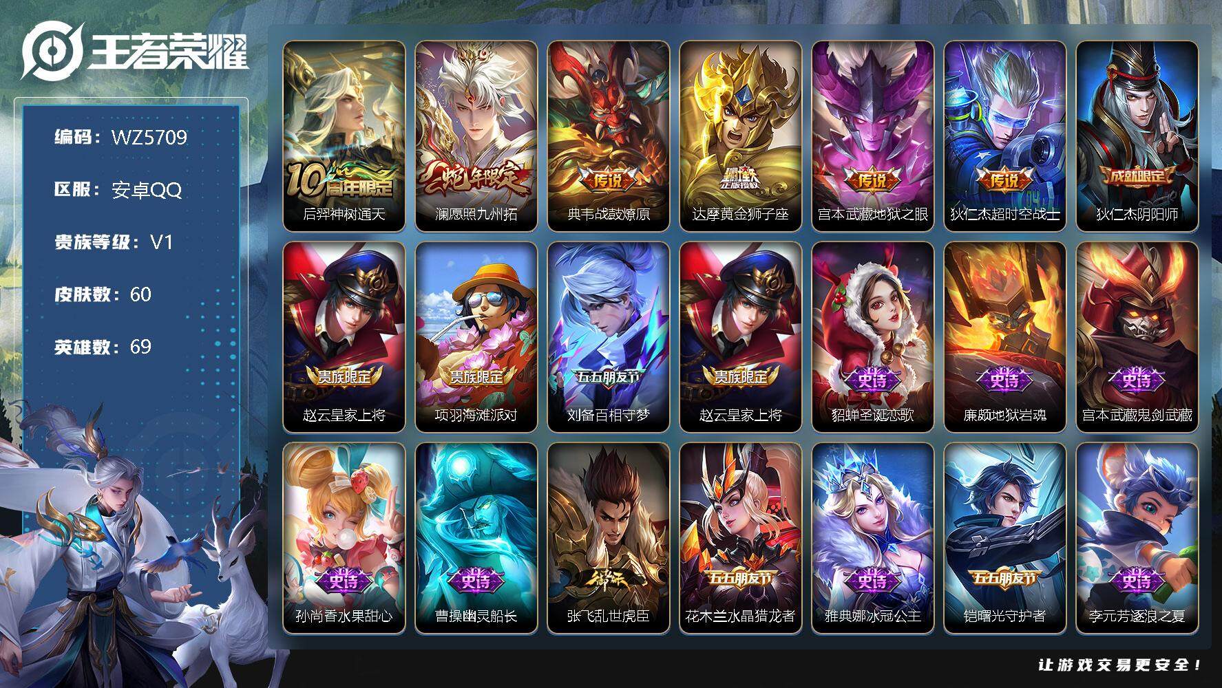 安卓Q-V1-永恒钻石III段位-69英雄-60皮肤-0典藏-0珍品无双-0无
