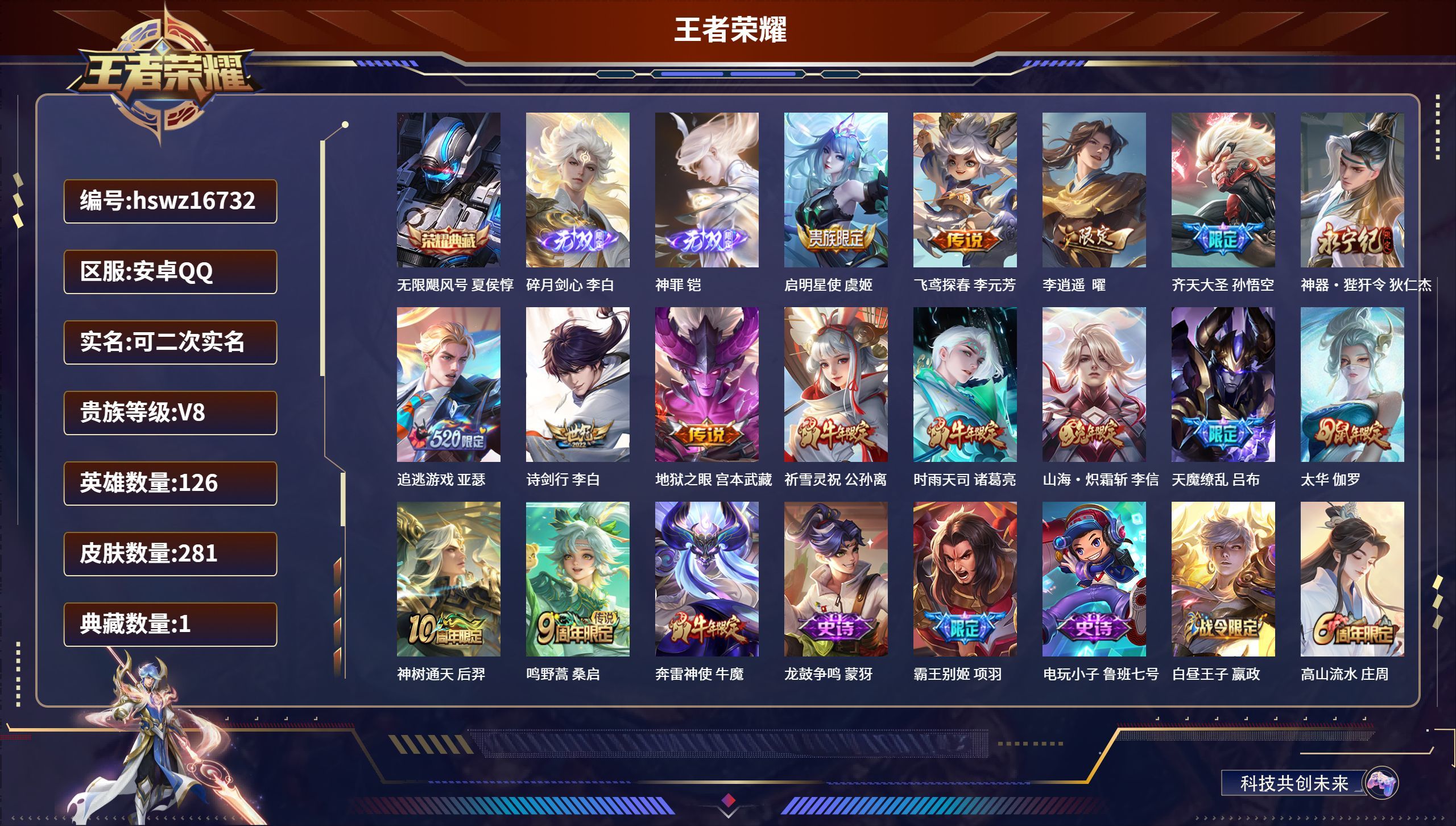 安卓QQ/非凡王者/281皮肤/126英雄/1典藏/0珍品无双/2无双/0珍品传说/15传说/77史