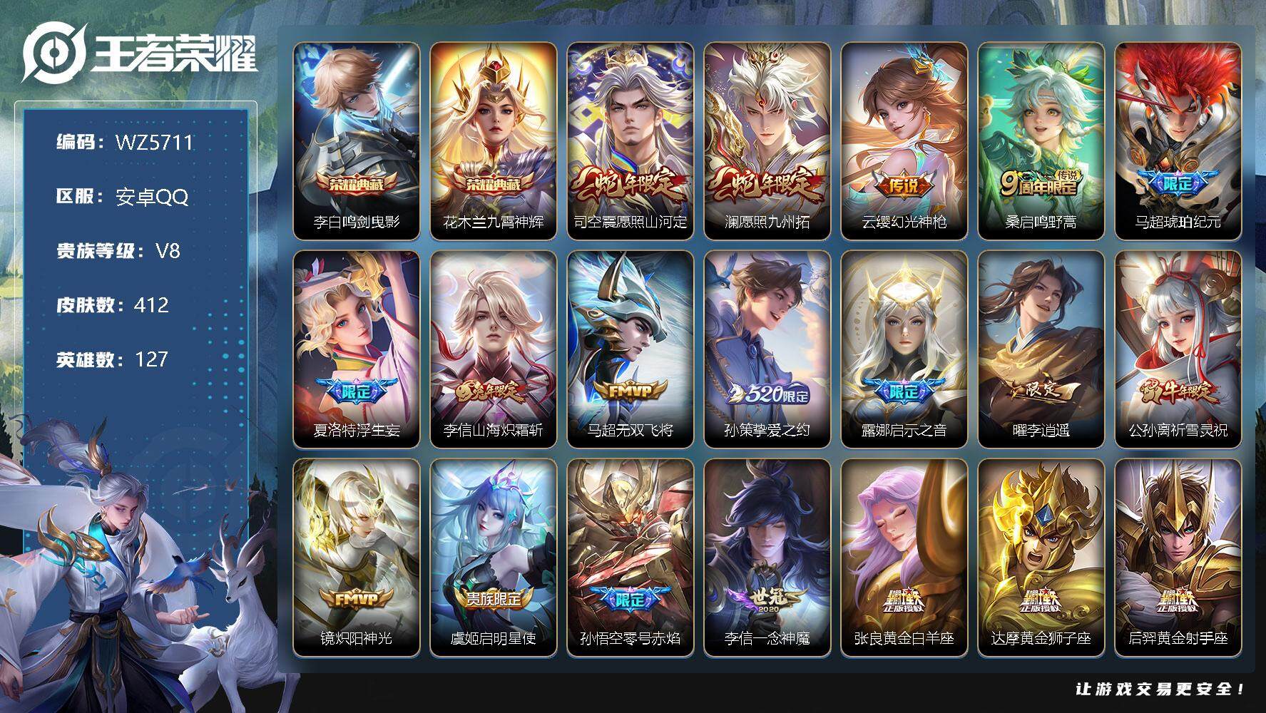 安卓Q-V8-最强王者段位-127英雄-412皮肤-2典藏-0珍品无双-0无双