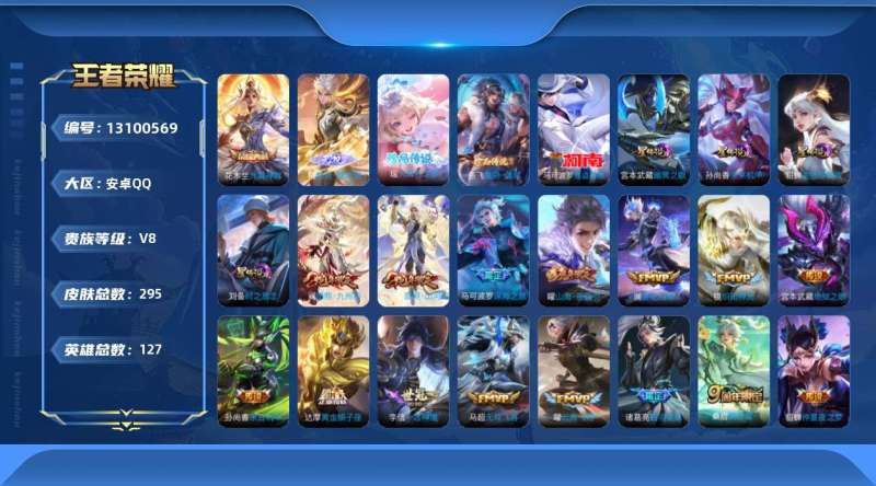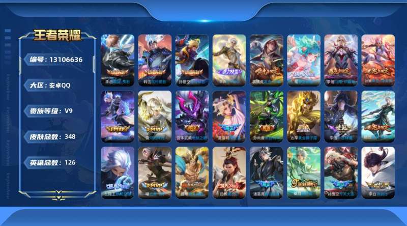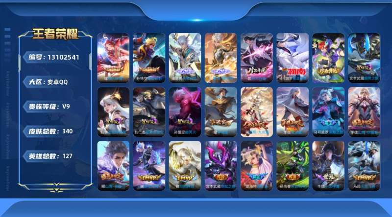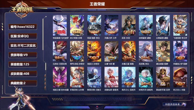 安卓QQ/非凡王者/408皮肤/125英雄/2典藏/0珍品无双/0无双/2珍品传说/39传说/127