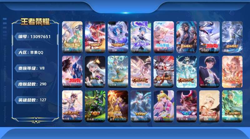 苹果QQ/最强王者/602皮肤/127英雄/5典藏/0珍品无双/5无双/6珍品传说/102传说/20