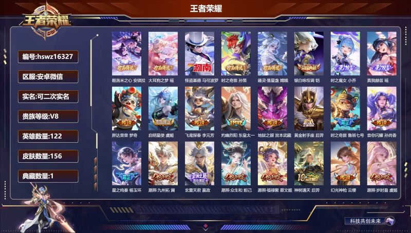 安卓v/最强王者/156皮肤/122英雄/1典藏/1珍品无双/2无双/5珍品传说/20传说/52史