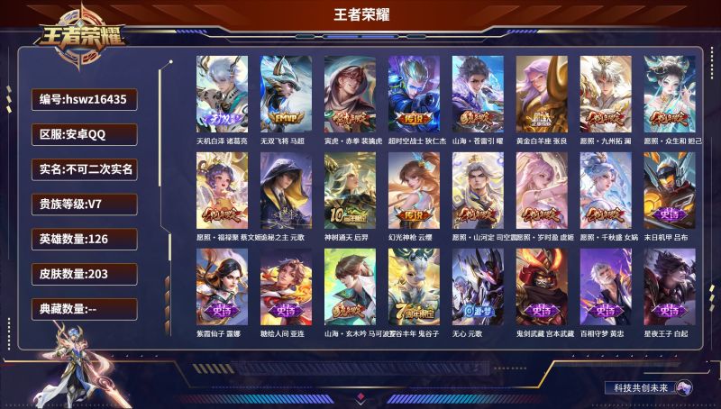 安卓QQ/非凡王者/203皮肤/126英雄/0典藏/0珍品无双/1无双/0珍品传说/14传说/51史