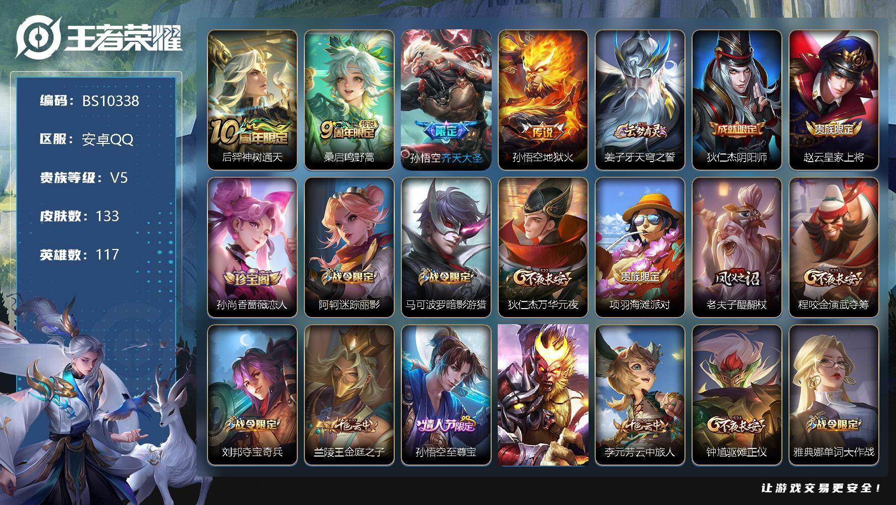 安卓Q-V0-永恒钻石V段位-117英雄-133皮肤-0典藏-0珍品无双-0无