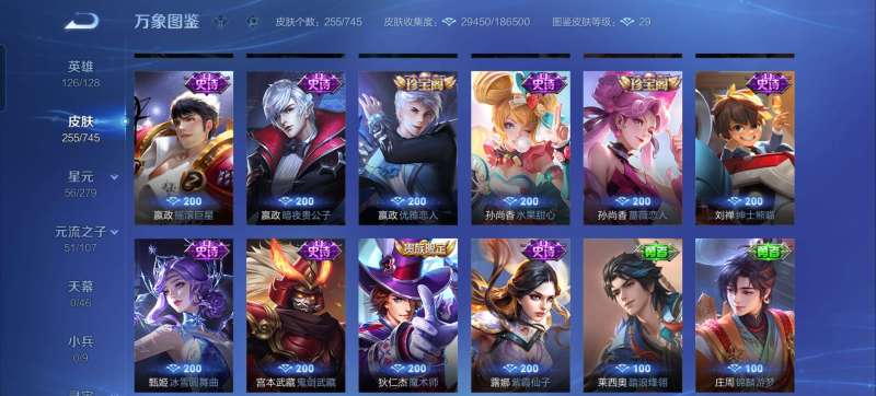 十一传说64限定。48史诗。英雄126皮肤255贵族7