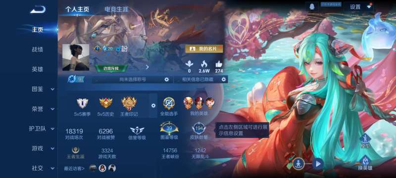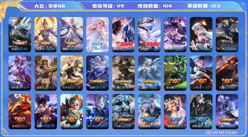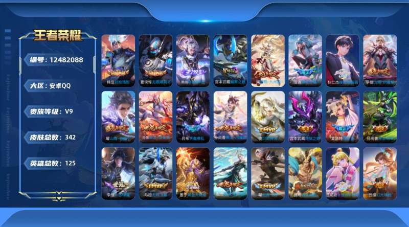 贵族等级: V9 英雄数: 126 皮肤数: 326 荣耀水晶: 杀手不太冷,