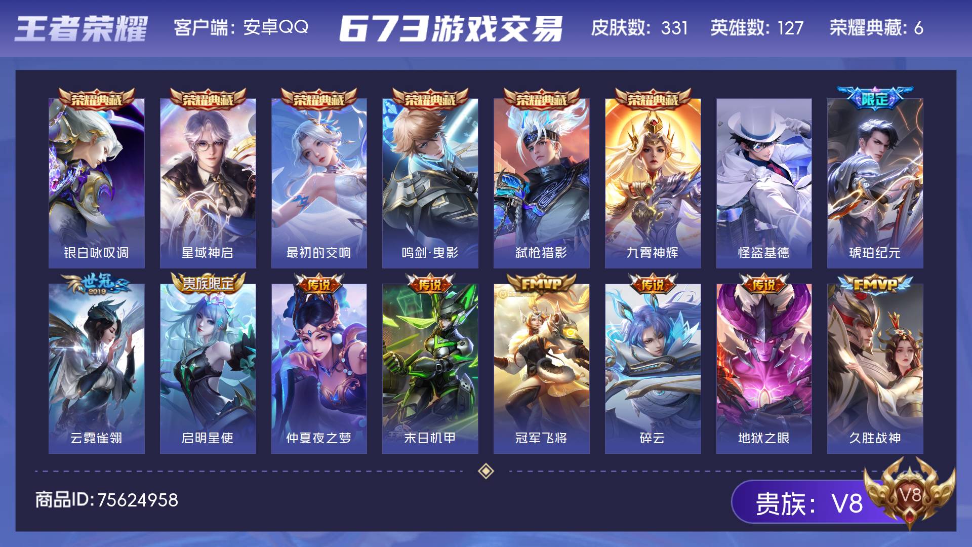 安卓Q- 皮肤331 英雄127 最强王者 荣耀典藏6 珍品传说1 传说11 其他皮肤316