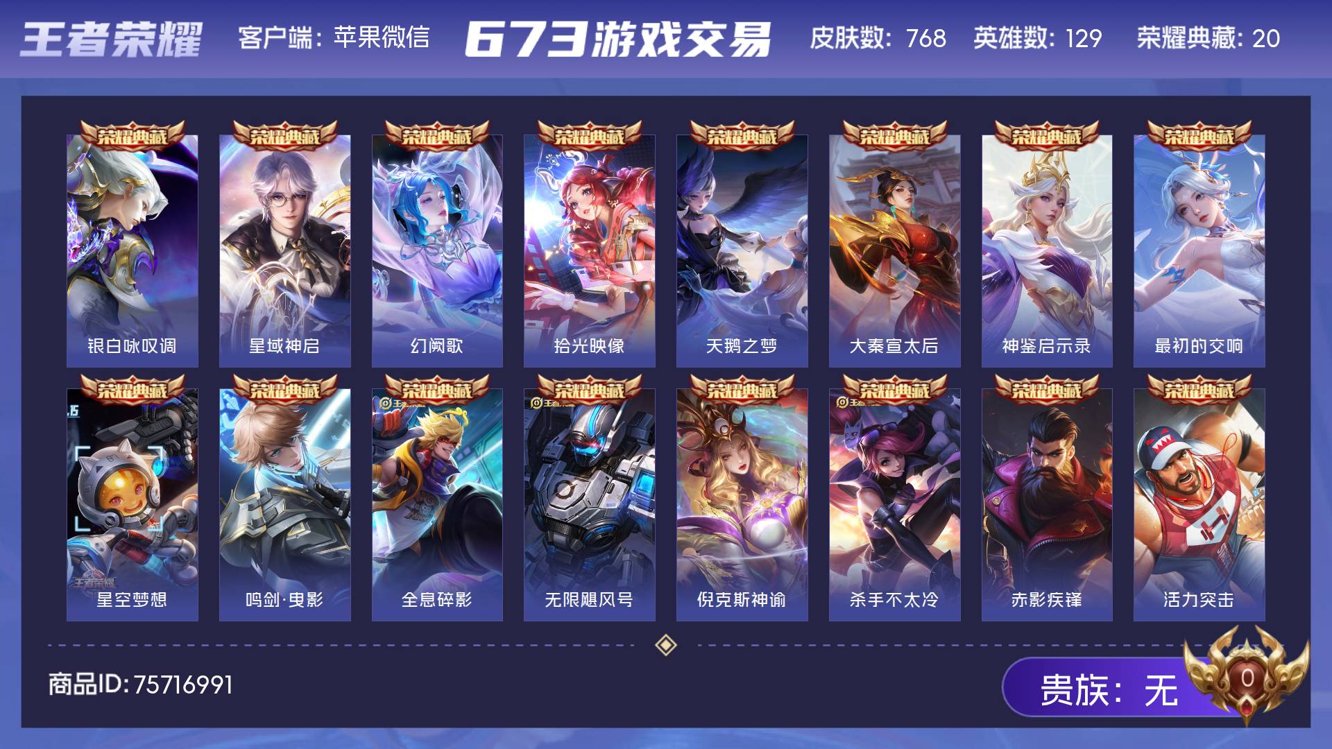 苹果微信(可二次可转区)福星全套,主页 头像框 满金色灵宝 今年的皮肤全部搞定,背包7000点卷 一个水晶-皮肤768-荣耀典藏20 珍品无双1 无双皮肤13 珍品传说9 传说131