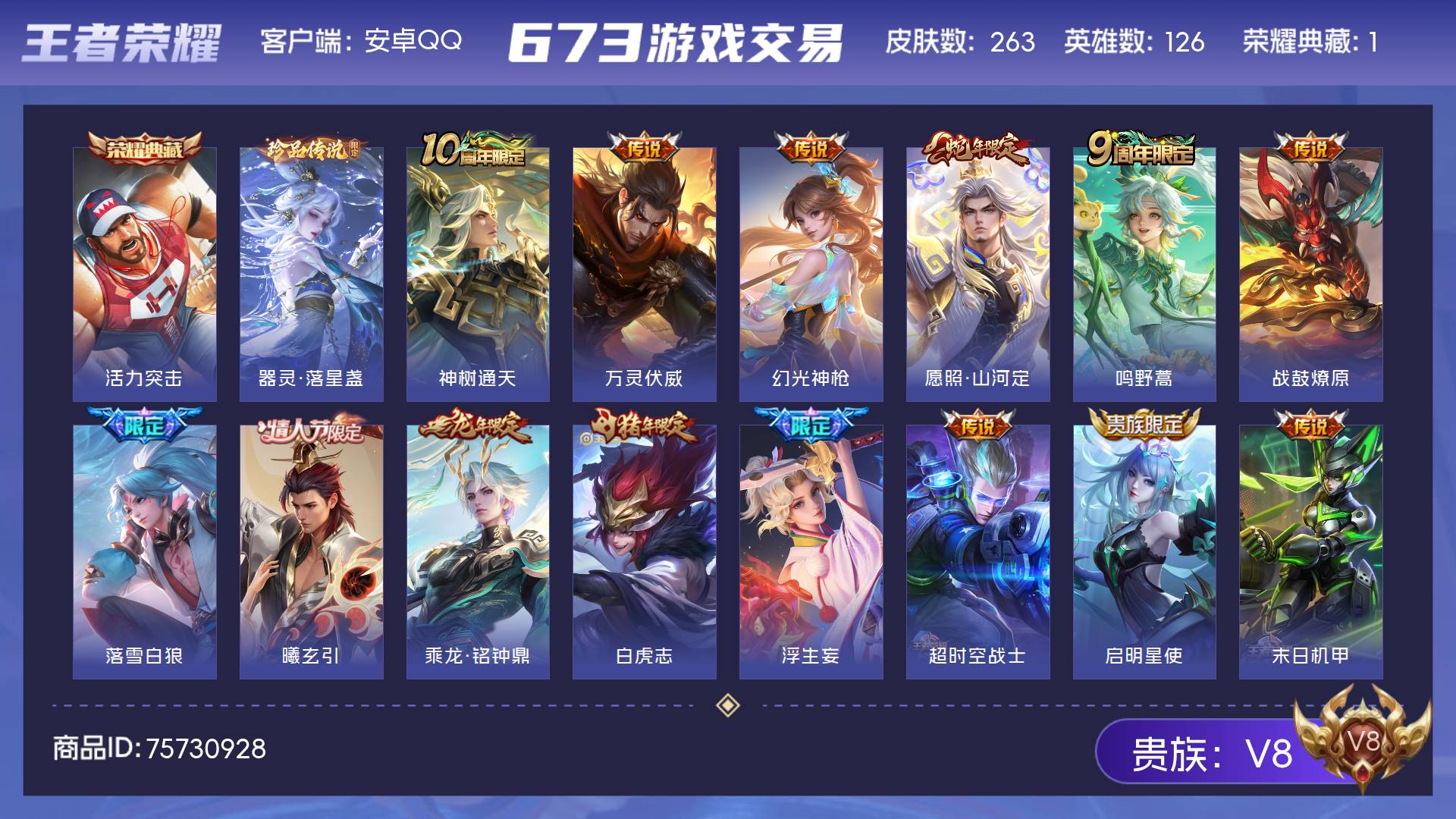V8 皮肤263 英雄126 荣耀王者 荣耀典藏1 珍品传说1 星传说2 传说28 其他皮肤238